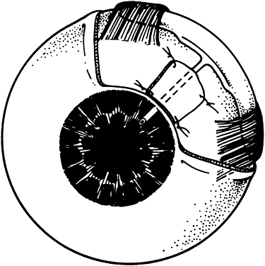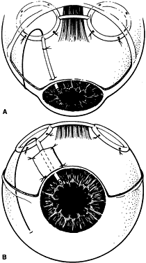 ANESTHESIA The operation may be lengthy but virtually all adult patients can be managed safely and comfortably with local anesthesia. The local anesthesia may be supplemented by subconjunctival infiltration with local anesthetic, which in turn is helpful in separating scarred subconjunctival tissue from the sclera. If the intraocular pressure is high (more than 35 mmHg), intravenous mannitol should be given (1 to 2 g/kg) over 30 to 45 minutes whenever medically acceptable. If the intraocular pressure is lowered, the magnitude of the reduction of intraocular pressure with surgery is not as dramatic and the risk of suprachoroidal hemorrhage or massive choroidal effusion may be reduced. EXPOSURE OF THE SCLERAL BED The conjunctival flap is raised by sharp dissection from the insertion at the limbus. The fornix-based flap is elevated, which allows direct visualization for further subconjunctival dissection to bare sclera. Alternatively, a conjunctival incision is made 4 to 6 mm from the limbus to raise a limbal-based conjunctival flap. This is helpful when there is a previous limbal filtration site, which is best avoided. If the old site is inadvertently reopened, the globe becomes hypotonus and it will be difficult to place the shunt reservoir. The superotemporal and superonasal quadrants are exposed with Westcott or curved Stevens scissors. The superior rectus muscle is located with a strabismus hook. The hook is passed from the superotemporal direction to avoid incorporating the superior oblique muscle. A 4-0 silk suture may be passed underneath the superior rectus tendon. Use of an anterior metabolite such as 5-fluorouracil or mitomycin C with tube shunt reservoirs remains controversial. Although it was demonstrated in an animal study that the blebs overlying the reservoir are thinner and contain less connective tissue,61 the clinical use of antimetabolites has not been shown to have any great benefit.62 PLACEMENT OF THE TWO MOLTENO PLATES The Molteno plate with the interconnecting tube slides into the superonasal quadrant (Fig. 4). A curved Hartman hemostat is passed underneath the superior rectus muscle in the temporal to nasal direction. The plate is grasped and pulled underneath the rectus muscle; this tight squeeze may traumatize the extraocular muscles. Placement of the interconnecting tube over the superior rectus muscle usually is sufficient and avoids the difficulty of passing a reservoir under the superior rectus insertion. Posterior to the insertion of the rectus muscles, a partial-thickness scleral pass is made with 6-0 Mersilene suture* on a spatula needle in both quadrants to anchor the plates. The plates are secured by tying one or two 6-0 Mersilene sutures that are passed through the plate anterior positioning holes. The anterior edge of the plates should be no closer than 8 mm from the limbus. Ethicon, Inc, Somerville, NJ. ADJUSTING TUBE FLOW A 4-0 nylon suture is inserted into the distal end of the tube (Fig. 5). A 6-0 polyglactin (Vicryl*) suture is tied externally around the tube. Balanced salt solution is injected through the proximal end of the tube to ensure that fluid passage through the tube meets resistance but is not totally occluded. This approach allows the tube to be partially functional for the first few days and weeks and eliminates the need for an adjunctive trabeculectomy-filtering site for temporary intraocular pressure control, as in situations when the tube is totally occluded. It also ensures that profound hypotony is avoided, as typically occurs if the tube is not partially occluded. The other end of the suture—with the needle—is passed through the subconjunctival space into the inferonasal aspect, where it is externalized. The exposed excess suture and needles are then cut off (Fig. 6). An alternative approach is to totally occlude flow with the external ligature. Venting foots are made in the tube proximal to the external ligature. These vents are created with a sharp microblade and allow fluid flow at high intraocular pressures until the external ligature dissolves or is cut. Ethicon, Inc., Somerville, NJ TUBE PLACEMENT IN THE ANTERIOR CHAMBER The tube is shortened obliquely with a Vannas scissor, so that about 2 mm is in the anterior chamber, with the tube bevel facing anteriorly (Fig. 7). A sharp bevel makes entry through a tight sclerostomy easier. Additionally, the tube opening is less likely to be occluded by fibrin, blood, or ocular tissue. A 23-gauge needle is passed through the limbus, creating a 1- to 2-mm intrascleral tunnel before entry. The external opening is enlarged slightly with the needle to allow easier tube entry. The needle is passed in a direction to keep the tube pointed away from the cornea but not touching the iris or lens. Occasionally, viscoclastic injection is helpful to keep the anterior chamber deep before the tube entry. If the tube insertion is difficult, the 4-0 intraluminal nylon suture can be used as a stent. The tube tip with the suture is kept more rigid and it allows easier entry into the anterior chamber. Alternatively, if a total vitrectomy has been performed, the tube can be placed through the pars plana into the vitreous cavity. PATCH GRAFT Using only a conjunctival closure over the tube may result in conjunctival erosion and tube exposure, with a definite risk for endophthalmitis (Fig. 8). A limbal-based or rotational scleral flap tied over the tube may vault the intraocular portion of the tube anteriorly against the cornea. It is simpler to use donor tissue to cover the tube. The donor tissue may be sclera, fascia lata, cornea, or pericardium. The pericardium is commercially prepared and packaged. The other tissues may be obtained through regional eye banks. Less available but potentially acceptable tissue is amniotic membrane or dura. After the patch is trimmed and thinned to the desired specifications, four 10-0 nylon sutures anchor the patch graft over the tube. Care should be taken to cover the an