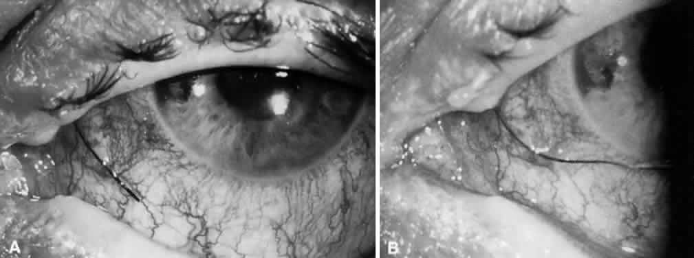 RETRACTED TUBE. If the tube has retracted from the anterior chamber, it is necessary to confirm this finding with gonioscopy. If the tube is too short, it may be necessary to move the reservoir plate closer to the limbus to allow enough slack for the tube to remain in the anterior chamber or to place an extender sleeve tube with a larger diameter over the preexisting tube to “lengthen it.”80 Hypotony A shallow anterior chamber and low intraocular pressure suggest either overfiltration, conjunctival wound leak, or occult globe perforation. Available methods to prevent profound hypotony and flat anterior chambers include a two-stage approach69,81; placement of an external absorbable suture (e.g., 5-0 Vicryl)82 or releasable sutures83,84 to totally occlude the tube; use of a nonabsorbable (8-0 nylon or 10-0 Prolene* suture that externally occludes the tip of the tube within the anterior chamber85,86; the ripcord suture, usually within the lumen of the tube87–90; valve shunts; and dual chamber reservoirs.91,92 Ethicon, Inc., Somerville, NJ With a two-stage approach, the reservoirs are placed in the subconjunctival region and the tube is left in the subconjunctival space. Anterior chamber entry is deferred until a later date. In a second operation after subconjunctival healing occurs, the tube is placed in the anterior chamber without disturbing the fibrous tissue encasing the reservoirs. This fibrous capsule provides resistance to outflow when the tube is placed in the anterior chamber. The disadvantage of this approach is that it involves two separate operations, without adequate intraocular pressure control after the first stage unless a concomitant trabeculectomy is done. With an absorbable suture such as 5-0 Vicryl, the tube can be totally occluded. The suture usually is absorbed within 3 to 5 weeks to allow patency of the tube to be re-established. This time also allows adequate subconjunctival fibrosis and resistance to outflow. The time needed for sutures to absorb varies from patient to patient, however; in some, the sutures may not absorb at all. When a releasable suture is used and externalized, a tract is left, which may lead to subconjunctival infections and perhaps endophthalmitis. When the tube is closed with sutures that are tied around the tube tip, the sutures must be visible and allow later laser suture lysis to open the tube. It is necessary to have a clear cornea and anterior chamber for laser release of the ligature. The procedure that has gained the most favor is the intraluminal suture that is left in the subconjunctival space. When the intraocular pressure becomes elevated, the suture is removed simply by making a small conjunctival incision and pulling the suture out (see Fig. 13). To stop or slow outflow, an external ligature is tied around the tube (e.g., 6.0 Vicryl). By injecting balanced salt solution through the tip, the fluid can be assessed. If totally occluded, some advocate making cuts in the proximal portion of the tube to temporarily “vent” if the ocular tension rises too high. The valve shunts, although theoretically attractive, are unpredictable because hypotony may still occur, even with the valve mechanism. The dual chamber implant is a modification of the Molteno reservoir plate, with a subsidiary ridge that compartmentalizes the reservoir. It allows the episcleral tissue to function as a pressure-sensitive valve. If the first compartment is inadequate to control the intraocular pressure, the episclera is pushed off the ridge, allowing aqueous access to the second compartment of the reservoir. This system is more unpredictable than the valve shunts, and hypotony occurs frequently. OVERFILTRATION. Before the advent of intraluminal sutures and external ligatures around the tube, overfiltration and flat anterior chambers were common problems. This problem may decrease with the use of an intraocular pressure-sensitive valve but both overfiltration and inadequate filtration may occur. Temporary elevation of intraocular pressure can be achieved with injection of a viscoelastic agent into the anterior chamber. This may help until adequate subconjunctival fibrosis develops to provide more resistance to aqueous outflow. If large choroidal detachments are present, choroidal drainage in the inferotemporal quadrant and anterior chamber reformation combined with tube ligation may be necessary. CONJUNCTIVAL WOUND LEAK. A wound leak may be identified by Seidel testing at the incision site and any suspected conjunctival buttonholes. When there is a brisk leak, patching and gluing usually is little help and resuturing is required. If the leak is not repaired, there may be persistent hypotony, with a significant risk of endophthalmitis. If the conjunctival hole or wound gape is over the plates, it may be more difficult to close unless a fine suture with a tapered vascular needle (e.g., the BV-100 series* with 10-0 nylon) is used. These small-caliber vascular needles minimize the size of the holes made with the needle because only the tip cuts through the tissue. Ethicon, Inc., Somerville, NJ GLOBE PERFORATION. When the plates are sutured into position, an inadvertent full-thickness scleral hole may be made. This risk is greatest in eyes with thin sclera, such as those that are buphthalmic or that have undergone numerous ocular procedures. Usually these holes close spontaneously but retinal detachment or vitreous hemorrhage can occur. LATE COMPLICATIONS Elevated Intraocular Pressure BLEB ENCAPSULATION. Within the first month after surgery, bleb encapsulation may occur. The course is similar to that after limbal filtration surgery. The encapsulation resolves gradually, with a drop in the intraocular pressure over a period of about 1 month. The blebs over the plates characteristically appear elevated, thick, vascular, and tense. Treatment should be conservative, with the use of aqueous suppressants, although needling and administration of 5-fluorouracil is advoc