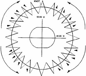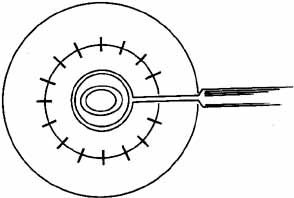 The previously placed methylene blue radial keratotomy marks are used to guide the positioning of the 12 o'clock suture pass. The suture is passed though the two tines of the forceps, making sure that the pass is completed in as radial an orientation as possible. The ratio of the distance from the entry of the needle on the donor to the exit on the host cornea is ideally one-third donor to two-thirds host. The Hofmann-Polack forceps are then exchanged for 0.12 mm Maumenee forceps. The suture is tied in place using a slipknot (two-one throw) and then cut using Vannas corneal scissors (Fig. 7). Both tags can be left long so as to be able to adjust suture tension based on intraoperative keratoscopy after the placement of the first eight sutures. The cut sutures are gently draped away from the visual axis, and the donor tissue is grasped at the 6 o'clock position, 180 degrees away from the first suture. A similar technique is used in passing the suture at this position. Symmetry of the pass can be estimated by noting the tissue alignment as well as the symmetry at 3 o'clock and 9 o'clock. Also, as gentle tension is applied in tying the suture, a straight tension line will be noted in the graft tissue. This line should be oriented from 6 o'clock to 12 o'clock. Sutures are then passed at the 3 o'clock and 9 o'clock meridians, while taking into account the amount of tissue on either side of the pass. Upon completion of the four cardinal sutures, a symmetric diamond shape should be noted on the donor tissue. A total of eight interrupted sutures are placed, the ends of which are temporarily left long. The graft is then wetted with balanced salt solution, and a manual keratoscope, such as a circular metal loop or a von Luhnen keratoscope, is used to estimate astigmatism based on the compression or expansion of the reflected rings or ovoid reflex from the corneal surface. If suture adjustment is needed, the suture is grasped proximal to the knot. The suture is cut and rotated by pulling the grasped suture. The tension of the suture can then be adjusted by retying the knot based on keratoscopy. For the slipknots not needing adjustment, a third locking throw is placed. The details of suture adjustment to minimize postoperative astigmatism are discussed more thoroughly in the suturing techniques section. In patients undergoing simple keratoplasty, a running suture can be used (Fig. 8). A half section of 10-0 nylon suture is used, placing two suture bites between each pair of previously placed interrupted sutures. The ratio of the radial orientation is one-fourth the distance to either interrupted suture. On the final pass of the suture, the needle is left in place and the edge of the needle track is slightly expanded, using a 15-degree steel blade. This slight expansion facilitates the passage of a tied knot through corneal tissue. The suture tension is adjusted using two smooth tying forceps, grasping the suture in an “end over end” fashion to maintain tension throughout the adjustment. The suture tightening begins 180 degrees from where the knot will be placed, and two passes in both directions are made. The cornea is again wetted, and intraoperative keratoscopy is performed with appropriate suture adjustment. A knot is then tied and the suture is gently rotated to bury the knot. In patients with peripheral corneal neovascularization, multiple interrupted sutures can be placed, thereby facilitating suture removal based on local suture vascularity. A total of 16 interrupted sutures are adequate to approximate the graft to the host tissue in the majority of patients.