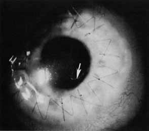 suture. Epithelial problems after penetrating keratoplasty include defects secondary to cell loss during or after surgery, epithelial irregularity, and superficial punctate keratopathy secondary to an inadequate tear film, localized trauma from aberrant eyelashes or eyelid scarring, and delayed or poor healing secondary to toxic keratitis medicamentosa from topical drops. Stem cell deficient states may result in poor epithelialization and potential conjunctivalization of the graft tissue. Persistent epithelial defects increase the chances of graft infection, scarring, and failure. Prompt initiation of therapy directed at the specific cause is required to promote epithelial healing. A transplanted cornea that never becomes clear is considered a primary graft failure and is a result of nonviable graft endothelial cells. Multiple factors may contribute to this endothelial decompensation. Surgical trauma or improper handling and storage of the donor cornea may lead to decreased endothelial cell function. Usually, the cause of endothelial loss is not known. A repeat transplant should be performed. Iris incarceration in the wound may be caused by mild or severe trauma, which creates a wound leak that is spontaneously closed as the iris moves into the posterior defect. An undetected capture of the iris by a full-thickness suture pass may also occur. A small incarceration may seem insignificant but serves to bring vascularized tissue into the corneal wound, increasing the chances of graft vascularization and rejection. In addition, progressive formation of PAS may occur, leading to severe glaucoma. Most postoperative hyphemas are small and resolve without sequelae. Large hyphemas may obstruct the trabecular meshwork, resulting in increased IOP and possible corneal blood staining. Blood that enters the vitreous cavity in aphakic eyes may take months to clear. Pupillary block glaucoma secondary to an intact hyaloid or intraocular lens pushing against the posterior iris manifests as a shallow anterior chamber with increased IOP. Another common cause is an air bubble in the vitreous, introduced at the time of surgery, blocking the pupil and iridectomy. Simple repositioning of the patient may move the air bubble and break the attack. Endophthalmitis may rarely occur in the early postoperative period. |