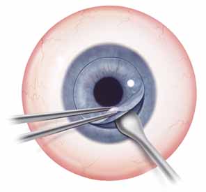 The host tissue is set aside and, upon completion of the procedure, will be sent to pathology for histologic examination and special staining as warranted by the indication for corneal grafting. Until the donor tissue is securely sutured into place, however, the original host tissue should be available, in case it is needed to close the eye. Also, a temporary keratoprosthesis, such as the Cobo keratoprosthesis, should be available to help maintain the integrity of the globe. At this point of the procedure (i.e., when the host cornea is being removed and the globe pressure is equal to atmospheric pressure), the risk of suprachoroidal hemorrhage is greatest. This potentially devastating complication is caused by the rupture of a choroidal vessel, which results in rapid and uncontrolled bleeding in the suprachoroidal space. The hemorrhage may force the iris, lens, vitreous, retina, and other intraocular contents to prolapse out through the corneal trephination wound. Risk factors for surprachoroidal hemorrhage include previous intraocular surgery, elevated IOP, myopia, advanced age, and arteriosclerotic disease. Patients with large body habitus may be prone to increased intrathoracic pressure and may generate additional posterior pressure. These patients may be best approached with general anesthesia. Intraoperative risk factors include rapid decompression of IOP upon entry into the anterior chamber, Valsalva maneuver performed by the patient at the time of trephination, or compression and occlusion of the endotracheal tube resulting in a mechanical Valsalva maneuver. Management of a suprachoroidal hemorrhage is based on when it occurs during the procedure.13 Rapid recognition and response afford the best chance of salvaging the eye. If the hemorrhage occurs upon initial entry into the anterior chamber, the host cornea is sutured back into place, using 8-0 silk or 9-0 nylon sutures, which not only are easier to visualize and tie in rapid sequence, but also have greater tensile strength than 10-0 nylon sutures. Drainage of the hemorrhage can be accomplished by entering into the choroidal space by making a sclerotomy. If the hemorrhage occurs after the host cornea has been removed, the temporary keratoprosthesis is quickly placed into the wound to compress the hemorrhage and to keep intraocular contents in their correct anatomic positions. Our routine during host tissue removal is to have the assistant hold the temporary keratoprosthesis for rapid placement, and the assistant only returns it to the instrument table when all four cardinal sutures have been placed and tied. In the absence of a temporary keratoprosthesis, a surgeon may use his or her finger to tamponade the hemorrhage. Pressure is maintained until the hemorrhage stabilizes. Sclerotomy can be performed to drain the surprachoroidal hemorrhage, and then the donor or host tissue is sutured into place. Alternatively, sclerotomy and drainage of the suprachoroidal hemorrhage can be done at a later date if the intraocular contents can be successfully reposited at the the time of surgery. If possible, irrigating fluid can be placed into the anterior chamber via keratoprosthesis attachment or anterior chamber maintenance port. This fluid can help deepen the anterior chamber, resulting in more anatomic orientation of intraocular contents and may also facilitate evacuation of the hemorrhage. Upon successful entry into the anterior chamber and removal of the host tissue, the donor tissue can then be secured to the patient. We will describe standard phakic keratoplasty and will then discuss specific situations, such as combined keratoplasty and cataract removal and also keratoplasty in the pseudophakic patient. Up to this point in the description of the procedure, the steps taken for combined procedures are similar to those in standard phakic keratoplasty. Simple Penetrating Keratoplasty In a simple PK, such as in patients with keratoconus, the donor cornea is transferred from the Teflon block to the surface of the eye using a Paton spatula. This transfer is done immediately adjacent to the patient's eye in the operating field to minimize the likelihood of inadvertent tissue loss onto a nonsterile field. The surgeon's dominant hand is used to lift the donor graft. Viscoelastic substance is placed on both the endothelial side of the donor button and on the host corneal tissue rim. The donor tissue is brought to the host rim, and it is tipped slightly by touching the cut edge of the graft to the 6 o'clock position on the viscoelastic-coated host rim. The tissue is tipped by rotating the wrist and the Paton spatula so that the graft is positioned almost perpendicularly to the host cornea. This position facilitates a precise grasping of the top edge of the donor tissue by split-tined Hofmann-Polack forceps (Fig. 5). These speciallydesigned forceps allow for the uninterrupted passage of a needle between the two toothed tines. After the elevated edge of the graft is grasped by the Hofmann-Polack forceps, the surgeon quickly exchanges the Paton spatula for a preloaded needle driver containing a 10-0 nylon suture. The suture is first placed onto the donor cornea at the 12 o'clock position. The action of suture placement involves not only the passage of the needle onto the graft tissue, but also the placement of the graft tissue onto the needle. In this sense, one can think of “placing the graft onto the needle” in addition to passing the needle through the graft. The optimal exit depth of the suture is approximately 90% thickness, with the exit path extending radially through the stromal side cut of the donor graft tissue (Fig. 6). The donor tissue is released by the Hofmann-Polack forceps, and then the host rim is grasped.