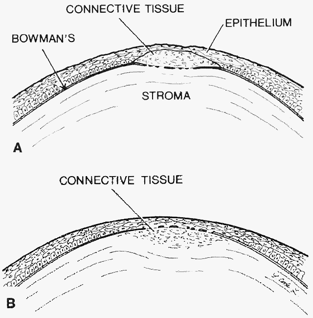 EPITHELIAL BASEMENT MEMBRANE DYSTROPHY (MAP DOT-FINGERPRINT DYSTROPHY) Epithelial basement membrane dystrophy is the most common corneal dystrophy, affecting approximately 2% of the population.2 Although most patients remain asymptomatic, about 10% experience recurrent corneal erosions as a consequence of faulty attachment complexes. These attachment complexes consist of hemidesmosomes of the basal epithelial cells, the underlying basement membrane, and the subadjacent anchoring fibrils of Bowman's layer.3 After an erosion, persistence of devitalized epithelium and fragments of basement membrane may inhibit normal re-epithelialization and formation of secure attachment complexes. Simple superficial debridement for removal of abnormal epithelium and basement membrane, thereby leaving a smooth substrate of Bowman's layer, can be performed at the slit lamp. The adjacent normal epithelium can resurface this area, allowing formation of competent attachment complexes and resulting in prompt cessation of erosive symptoms with much reduced frequency of recurrences.4–6 This procedure can be employed if more conservative measures (i.e., lubricants, patching, bandage contact lenses) fail in halting the erosions. A smaller subset of patients with epithelial basement membrane dystrophy experience reduction of vision and/or recurrent erosions from the extreme deposition of an abnormal basement membrane and fibrillar collagenous material between the epithelium and Bowman's layer.2 This material may lead to irregular astigmatism and abnormal tear breakup. Patients typically complain of monocular visual distortion, diplopia, or “ghost images.” By performing superficial keratectomy, this abnormal material can be readily removed, leaving behind a smooth substrate of intact Bowman's layer. After re-epithelialization a smooth surface is re-established with the elimination of irregular astigmatism. REIS-BÜCKLERS DYSTROPHY Reis-Bücklers' dystrophy is an autosomal dominant condition characterized by the extensive accumulation of a fibrous subepithelial tissue that largely replaces Bowman's layer.2 Secondarily defective epithelial attachment complexes result in severe recurrent erosions. The accumulations of fibrous tissue also cause irregular astigmatism and a reticular anterior corneal opacification with diminished vision. The anterior location of this dystrophic process makes it amenable to treatment by superficial keratectomy.7,8 A dissection plane can frequently be developed between the fibrous tissue and the underlying normal stroma. Blunt dissection can then be used to peel the fibrous tissue until it is entirely removed (Color Plate 1: Color Fig. 1A-D). Our experience and that of others7,8 have been very favorable with this technique in achieving cessation of the erosions and improvement of vision. The fibrous tissue may recur after some years, but the procedure can be easily repeated. GRANULAR DYSTROPHY Granular dystrophy is an autosomal dominant condition characterized by the subepithelial and stromal accumulation of an eosinophilic granular material. In advanced cases corneal transplantation is necessary for visual rehabilitation. A superficial variant of granular dystrophy has been described that primarily involves Bowman's layer and clinically and histologically resembles Reis-Bücklers' dystrophy. Transmission electron microscopy is necessary to identify the typical lesions of granular dystrophy in these cases. These superficial variants tend to have an earlier onset and higher frequency of erosive symptoms than typical granular dystrophy.9,10 Fortunately, the predominantly anterior location of the lesions may allow for treatment by superficial keratectomy alone. Granular dystrophy can recur in corneal grafts. The recurrences in grafted corneas frequently take the form of an avascular fibrous connective tissue between the normal epithelium and Bowman's layer.2 The anterior location of recurrent fibrous tissue allows for easy removal from underlying Bowman's layer by superficial keratectomy.11 Thus, repeat penetrating keratoplasty with its attendant risks can be avoided (Color Plate 2: Color Figs. 2A AND B; 3A and B). KERATOCONUS Keratoconus is an ectactic dystrophy characterized by progressive thinning of the central or paracentral cornea. Indications for corneal transplantation include corneal scarring in the visual axis causing visual reduction or intolerance of contact lenses necessary to correct irregular astigmatism. Some patients become intolerant to contact lenses owing to the formation of a raised, localized area of superficial cornea that is chronically abraded by the contact lenses. Moodaley and co-workers12 have referred to this raised area as a “proud nebula,” and we have termed such a focal nodular scar as a “corneal callus.”13 Superficial keratectomy can be used to remove these focal fibrotic nodules and allow for resumption of contact lens wear. Penetrating keratoplasty can thereby be avoided in many appropriately selected cases. Histopathologic evaluation of the excised fibrotic nodules reveals fibrillar collagen in random array with few interspersed fibrocytes. The overlying epithelium is fragmented with discontinuous, multilaminar basement membrane and diminished hemidesmosomes. The nodules are anterior to Bowman's layer, and hence, a plane of dissection can be created between the fibrous plaque and the underlying stroma, leaving stroma undisturbed (Fig. 2; Color Plate 3: Color Fig. 4A-C). VERNAL KERATOPATHY Vernal disease is a seasonally recurring, bilateral inflammation of the conjunctiva that occurs in children and young adults who have a history of atopy. Vernal keratopathy presents as punctate epithelial keratitis, subepithelial scarring, and large epithelial erosions with plaque formation. This plaque consists of a fibrin-like exudate that is resistant to medical therapy and can become chronic. The vernal plaque can be successfully removed by superficial kera