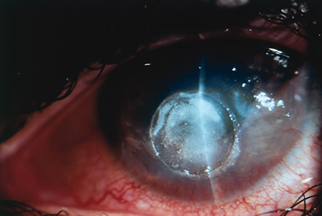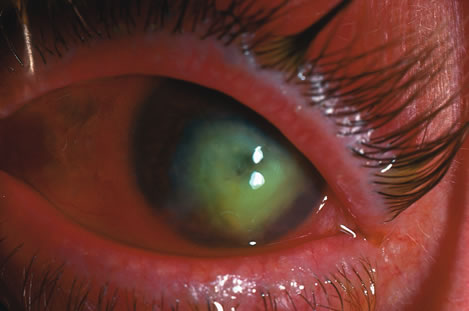 or radiation leading to ulceration may lead to perforation. Infection is probably the most frequently encountered source of corneal perforation. Direct invasion of microorganisms, proteolytic enzymes elaborated by organisms, corneal cells and inflammatory cells, persistent loss of epithelium, and decreased corneal sensitivity may all enhance the likelihood of ulceration and perforation in the presence of corneal infection. Bacterial, viral (Fig. 1), fungal, and protozoal infections can all result in loss of corneal substance and perforation. A suggestion has been made that the type of treatment of ulcers may affect perforation with an increased perforation rate reported following fluoroquinolone treatment of bacterial keratitis.1