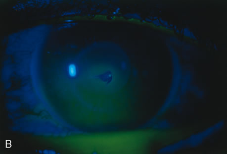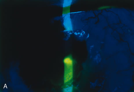 fluoresces under cobalt blue light at the slit lamp (Fig. 2A). The same information may be obtained by moistening a fluorescein