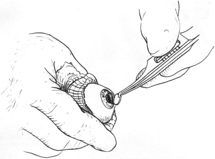 problem so that ulceration and perforation will not recur. With infectious processes, appropriate antimicrobial therapy must be initiated. Often, 24 hours of appropriate antibiotic treatment is carried out in bacterial perforations before definitively treating the perforation. In situations in which eyelid deformity has led to the problem, the eyelid abnormalities can be addressed concurrent with the treatment of the perforation. The same is true of patients with dry eyes in whom tear replacement, punctal occlusion, and other measures can be carried out at the same time as treatment of the perforation. With decreased corneal sensation, tarsorrhaphy can be performed after treatment of the perforation. In inflammatory conditions, immunosuppressant treatment may be necessary coincident with definitive repair and systemically or topically after repair.4 Definitive, that is, reparative, treatment of corneal perforation depends on the cause, location, size, and status of treatment of the underlying condition. Accompanying problems such as endophthalmitis and cataract may also play a role in the decision on definitive treatment. Self-sealing perforations may need no reparative treatment. These perforations may occur with shelved lacerations or with small puncture wounds in which tissue swelling occludes the perforation tract. Wounds that are sealed by tissue prolapse usually require repair. Self-sealed wounds with tissue displacement may also be best repaired to reduce the likelihood of induction of irregular astigmatism. Very small perforations with no associated tissue displacement may be amenable to the use of patching or soft contact lens placement. This is most likely to be effective in small leaks evident only with pressure or in descemetoceles in which tissue stabilization is essential to allow healing and in which the inciting process is under control.5 Small dry eye perforations are perhaps the most responsive to this approach. When soft contact lenses are used, frequent follow-up is essential, and more aggressive techniques may be necessary if this fails. The use of tissue adhesives is an appealing approach to treatment of small perforations or descemetoceles with impending perforation. The advantage is that the adhesive may be applied under topical anesthesia at the slit lamp or in a minor procedure room. The disadvantages are that the glue may induce significant inflammation, may be uncomfortable for the patient, may adhere inadequately, may serve to harbor organisms once polymerized,6 and is often effective only in small perforations that can be readily dried. The tissue adhesives most commonly used in the United States are cyanoacrylates, usually isobutyl or higher alkyl compounds. None of these are approved for ophthalmic use by the Food and Drug Administration. 2-Octyl cyanoacrylate (Dermabond, Ethicon, Somerville, NJ) is approved by the U.S. Food and Drug Administration (FDA) for use on skin and has been effective in sealing corneal perforations. These substances polymerize rapidly when in contact with water. Various techniques have been described for the use of tissue adhesives. All require débridement of necrotic tissue and epithelium surrounding the perforation, drying of the area to which the glue is to be applied, and application of the least amount of glue that can cover the defect. Drying of the defect can be carried out with cellulose sponges, and air or viscoelastic may be placed behind the perforation to separate tissue and reduce the fluid present.8 The glue itself may be applied to a small plastic disk and then placed over the perforation (Fig. 3), applied directly from the tip of a fine needle attached to a tuberculin syringe,9 or applied with a specially made plastic applicator (Squeez-ett, Ellman Manufacturing Co, Hewlett, NY).10,11 The glue may come off and need to be reapplied, at times repeatedly. Usually, because of the rough surface of the polymerized glue, a bandage soft contact lens is placed on the eye after the glue has polymerized. The glue may be left in place until there is obvious healing of the perforation, until the glue spontaneously loosens because epithelium has grown beneath it, or until a more definitive procedure such as keratoplasty is carried out. Fibrin adhesives (e.g., Tisseel, Immuno Canada, Ltd) may be used in a similar fashion but have less inherent strength than the cyanoacrylates and have been used less frequently in the United States.12 Photopolymerized sealants are also being studied. These have the advantage of more controlled polymerization and hardening through laser irradiation after adhesive placement rather than the uncontrolled, very rapid polymerization seen with the cyanoacrylates.13