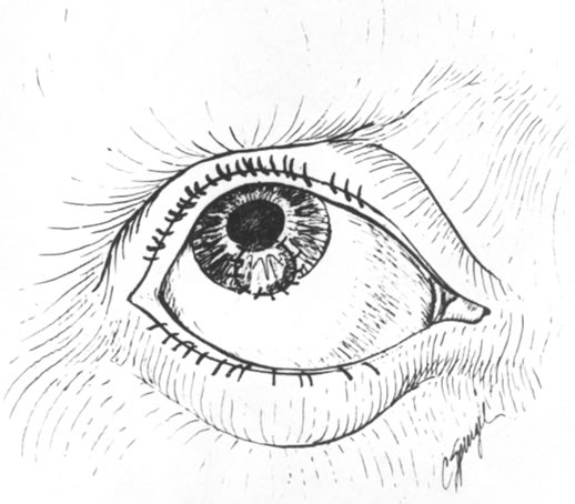 Exposure of the cornea due to abnormal lid function as can be seen after eyelid injury or ectropion from herpes zoster, or with limited lid closure and poor Bell's phenomenon as seen in some myopathies and neuropathies may lead to drying of the corneal surface, loss of epithelium, lysis of corneal stroma, and perforation. Entropion with trichiasis may also lead to corneal trauma and subsequent ulceration. Tear insufficiency and ocular surface disorders may be associated with disruption of the epithelial barrier of the cornea and subsequent ulceration and perforation. Inflammatory conditions affecting the cornea may also lead to melting and perforation. Rheumatoid arthritis may cause marginal melting or central melting and perforation.2 Wegener's granulomatosis may cause similar changes. Inflammatory syndromes of unknown etiology, including Mooren's ulcer, Fuchs' superficial marginal keratitis, and Terrien's degeneration, may lead to corneal perforation. Corneal inflammation induced by bacterial toxins and abnormalities of meibomian secretions in phlyctenulosis and rosacea may lead to perforation as well. Conjunctival inflammatory disorders including Stevens-Johnson syndrome and mucus membrane pemphigoid may lead to entropion and trichiasis, with ultimate corneal disruption and perforation. Other disorders that may be associated with corneal perforation include keratomalacia secondary to vitamin A deficiency and, very rarely, keratoconus with hydrops.3 |