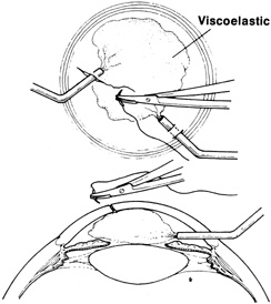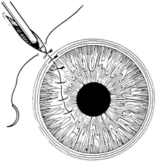 Partial-Thickness Corneal Lacerations Corneal lacerations that appear to be nonperforating must be examined carefully to rule out any rupture of Descemet's membrane. Seidel testing with 2% fluorescein should be performed to check for microscopic leaks. Gentle digital pressure may reveal a self-sealing wound. Such self-sealing wounds may be a result of stromal swelling when tears and aqueous come into contact with raw stroma. If the injury is indeed full thickness, treatment strategy is notably affected whereas partial thickness injuries may be treated on an outpatient basis, full-thickness lacerations are at risk for endophthalmitis and hospitalization with intravenous antibiotic usage may be considered. The goals in treating partial thickness corneal lacerations include preventing infection and promoting re-epithelialization and stromal healing. Every effort is made to minimize scarring and surface irregularity. If the wound edges are in good apposition with no wound gape, pressure patching with the use of prophylactic topical antibiotics is sufficient. Re-epithelialization is usually rapid. If the wound is unstable, a bandage soft contact lens may be used to support the wound and encourage re-epithelialization by minimizing the traumatic effect of lid movement (Fig. 2). Topical antibiotic prophylaxis, as well as cycloplegia for comfort, is used while the lens is in place. The lens should remain in place until wound healing is stable and complete re-epithelialization has occurred. Full-Thickness Corneal Lacerations BANDAGE SOFT CONTACT LENS. For small, self-sealing corneal perforations, a bandage contact lens may be sufficient to protect and support the wound as it heals. Such lacerations include nondisplaced, beveled, self-sealing wounds. If aqueous leakage persists for more than 24 hours or there is progressive shallowing of the anterior chamber, more definitive treatment should be undertaken. Treatment with a bandage contact lens in children should be done only with extreme caution and close follow-up care. In cases that respond satisfactorily, the contact lens should be kept in place until the wound has stabilized (usually 3–6 weeks). A protective shield should be worn at all times. Topical antibiotic prophylaxis and cycloplegia are recommended with the lens in place. TISSUE ADHESIVE. Cyanoacrylate tissue adhesive has been successfully used by ophthalmologists for many years despite not being approved by the U.S. Food and Drug Administration. Tissue adhesive is particularly useful for puncture wounds with small amounts of central tissue loss and selected small lacerations.4 Tissue adhesive should be applied to a dry, deepithelialized bed. A capillary microapplicator or fine-gauge disposable needle is used to apply a very thin film of adhesive over the site (Fig. 3). Alternatively, adhesive may be applied using a sterile 2- to 4-mm polyethylene or silicone disc affixed to the end of an applicator stick with sterile ophthalmic ointment. The disc may be left in place or removed with care. Three to five minutes are required for polymerization of the adhesive. A bandage soft contact lens is applied for comfort and to prevent the glue from dislodging. While the contact lens is in place, a prophylactic antibiotic drop is administered. Over time, the tissue adhesive dislodges spontaneously as the wound surface reepithelializes. Alternatively, it may be gently removed with forceps after adequate stromal healing has occurred. SUTURE REPAIR OF SIMPLE CORNEAL LACERATIONS. Most lacerating anterior segment injuries require the placement of corneal sutures. The primary goal of corneal suturing is to achieve a watertight wound. Secondary goals include minimizing scarring, restoring normal anatomic relationships, and reconstructing the normal corneal topographic contours. Local anesthesia may be used in selected cases. General anesthesia is used for more severe injuries or with an uncooperative patient, unless medically contraindicated. The affected eye is aseptically prepared and draped with caution to avoid any unnecessary pressure on the globe. To stabilize or manipulate the globe, 6-0 silk stay sutures may be placed at the limbus, 90 degrees away from the wound. Rectus bridle sutures may be passed as well, again taking care to avoid any pressure on the globe. If the anterior chamber is formed and the wound is watertight, sutures may be placed directly without entering the anterior chamber with instrumentation. For a wound that is less stable, a viscoelastic may be irrigated into the anterior chamber either directly through the wound itself or through a separate limbal paracentesis incision (Fig. 4). This will aid in re-forming the anterior chamber, tamponade intraocular contents, and protect the corneal endothelium, iris, and lens. Balanced salt solution or air may also be used to re-form the anterior chamber. In most cases, a limbal paracentesis is preferred because it will minimize disruption of the wound edges and permit better access as the case proceeds.5 A 15-degree sharp microsurgical knife or MVR blade may be used to create the paracentesis, placing the incision 90 degrees away from the wound. If a very shallow or flat anterior chamber is present, extreme care should be taken to avoid damage to the iris or lens when constructing the paracentesis site.