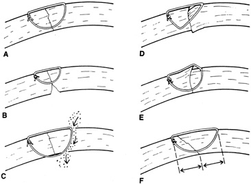 Temporary sutures may be used if the initial placement of deep definitive sutures would cause loss/flattening of the anterior chamber. These temporary sutures should be placed without distorting the wound. Accurate placement of the final definitive sutures can be achieved subsequently. The number of temporary sutures should be minimized, however, to prevent undue trauma to the wound margins and surrounding stroma. For corneal suturing, 10-0 monofilament nylon on a fine spatula-design microsurgical needle is used. This suture causes little tissue reaction, keeping vascularization and scarring at a minimum. Even finer 11-0 nylon suture may be used for lacerations near or involving the visual axis. Computed corneal topography analysis of corneal suturing techniques has suggested strategies designed to ensure adequate wound closure, minimize corneal scarring, and restore the native corneal contour.6,7 A number of options are available for suturing a corneal laceration. Tissue margins should appose as precisely as possible while suturing. The simplest method is to progressively halve the wound with simple interrupted sutures. Corneal sutures should be approximately 90% to 95% depth through the stroma, 1.5 mm in length, and of equal depth on each side of the wound. Shallow sutures create internal wound gape, whereas sutures of unequal length and depth on each side of the wound result in wound override. Sutures should generally not be passed through 100% thickness because the tract may theoretically act as a conduit allowing microorganisms from the external surface to enter the eye. For shelved lacerations, sutures should be placed equidistant with respect to the internal aspect of the wound and tied with minimal tension to achieve good tissue apposition, avoiding wound slippage with consequent tissue override (Fig. 5). Wounds with edematous or irregular margins generally require longer sutures for closure. Placement of sutures through the visual axis should be avoided. If it is necessary to pass sutures near the visual axis, they may be placed on each side of, but not directly through, the axis itself. In addition, the bite closest to the visual axis may be made shorter, thus avoiding this area (Fig. 6). A “no-touch” technique also may be used to minimize trauma at the visual axis. With this technique, the eye is secured by grasping the globe with forceps away from the cornea. The suture needle end is then placed perpendicular to the corneal surface, and the needle is rotated through the corneal tissue following the needle's curvature (Fig. 7).8