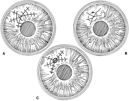 TRAUMATIC HYPHEMA Intervention Criteria Although hyphema is usually managed by medical and supportive therapy, approximately 5% of patients with hyphema will require surgical intervention.29–32 There are three general clinical indications for surgery predicated on (1) intraocular pressure, (2) corneal blood staining, and (3) amount of blood and inflammatory debris in the anterior chamber.29 Intraocular pressure criteria include intraocular pressure greater than 50 mm Hg for 5 days or greater than 35 mm Hg for 7 days to avoid optic nerve damage. Earlier intervention is indicated in patients with preexisting glaucomatous optic nerve changes and sickle cell disease because of their greater susceptibility to optic nerve damage and vascular occlusive disease. To prevent significant corneal blood staining, surgery should be performed at the first sign of blood staining on slit lamp biomicroscopy or in total or near-total hyphemas with intraocular pressure greater than 25 mm Hg for 5 days. To prevent formation of peripheral anterior synechiae, surgery is performed for large clots persisting longer than 10 days and for total hyphemas that have not resolved by day 5. These are generally conservative criteria. More urgent intervention may be helpful in selected cases. Surgical Techniques PARACENTESIS WITH ANTERIOR CHAMBER WASHOUT. This method is the easiest and safest procedure to clear blood from the anterior chamber (Fig. 21A).33 Two clear corneal paracentesis incisions approximately 2 mm long are made at the 10 and 2 o'clock positions or over the dependent portion of the hyphema. Balanced salt solution in a syringe with a 25- or 27-gauge cannula is used for irrigation through one paracentesis port into the anterior chamber. The posterior lip of the second paracentesis incision is depressed to allow the blood to exit. A dual-port manual or automated irrigation/aspiration system may also be used. Evacuation of the suspended free red blood cells and debris is desired; the formed clot itself may be left behind. This technique is safe, is easy to perform, and may be repeated as needed. Stromal hydration is used to seal the paracentesis ports. The conjunctiva is spared throughout the procedure in case future filtration surgery is warranted. AUTOMATED HYPHEMA REMOVAL. This technique is performed with an automated cutting/aspiration vitrectomy instrument and is used to remove more of the formed clot than is possible with the anterior chamber washout technique (Fig. 21B).34 A bimanual method is performed using the same paracentesis ports as in the anterior chamber washout method (above). This method is particularly useful if vitreous is present in the anterior chamber. Intraoperative bleeding may also be better controlled because the infusion can be used to tamponade the bleeding site. In addition, intraocular bimanual diathermy may be directly applied to bleeding vessels.35 A dual port vitrector with infusion line may also be used. In either case, extreme care must be taken to avoid trauma to the corneal endothelium, iris, and lens. LIMBAL CLOT EXPRESSION. For the management of large clots, limbal clot delivery has been suggested (Fig. 21C).36 This technique should not be performed until the clot reaches maximal consolidation and retraction at days 4 to 7.37,38 Expression of the clot may be combined with peripheral iridectomy and anterior chamber washout. Important disadvantages of this procedure include the large incision required and the possible inadvertent expression of iris, lens, and vitreous. OTHER PROCEDURES. For larger hyphemas causing pupillary block glaucoma, a peripheral iridectomy in combination with anterior chamber washout may be used.39 Trabeculectomy combined with peripheral iridectomy and anterior chamber washout may also be used and may allow better intraocular pressure control postoperatively.40 Rebleeding occurs in 3.5% to 38% of patients with traumatic hyphema and most frequently occurs 2 to 5 days after injury.41–55 Surgical intervention is based on similar conditions such as elevated intraocular pressure, corneal blood staining, and the formation of peripheral synechiae TRAUMATIC IRIS INJURY Iris disruption is a frequent concomitant of both lacerating and blunt anterior segment trauma. Surgical repair of iris damage resulting from lacerating injury is usually best performed in a later operation, especially when visibility is compromised during the primary procedure (see section on anterior segment reconstruction). Small sphincter tears are best left untouched. Larger sphincter tears, which may result in mydriasis, glare, and photophobia, may be managed pharmacologically with topical miotic agents or by the use of a tinted contact lens or sunglasses. Eccentric or secluded pupils can be managed by laser procedures in some cases. Surgical reconstruction of the iris in a closed system has been described by McCannel56 (Fig. 22). In a phakic eye, one must avoid injuring the anterior lens capsule and creating a traumatic cataract. Viscoelastic should thus be placed between the posterior iris and anterior lens capsule for protection. A limbal paracentesis is performed in a position that allows the suture needle to pass across the edge of the iris defect. Because it is less susceptible to hydrolysis and biodegradation, 10-0 polypropylene on a long needle (e.g., CIF-4, Ethicon) is used.57 The needle is introduced through the paracentesis port into the anterior chamber and then passed through the proximal edge of the iris laceration and then through the distal edge in one pass. The needle is then passed through the peripheral cornea out of the eye. After the needle is cut from the suture, a microhook is passed through the paracentesis port and retrieves the distal suture end, pulling it back through the paracentesis and outside the anterior chamber. The original suture end should be kept outside the eye at all times. The suture is then tied securely by pulling the iris up to the parace
