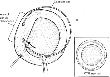 Once incarcerated or prolapsed tissue is excised or repositioned, the corneal laceration is sutured as described earlier. Careful inspection is warranted once closure is complete to ensure that no tissue incarceration persists. The anterior chamber should be filled through the paracentesis site, and wound integrity should be ascertained. CORNEAL LACERATIONS WITH LENS OR VITREOUS INVOLVEMENT. Perforating injuries may also have lens and vitreous involvement. Direct and indirect forces may damage the lens capsule, causing cataract formation. Penetration or rupture of the lens capsule often leads to lens opacification. Blunt trauma may result in globe distortion with equatorial expansion, which can cause capsular rupture or result in dehiscence of zonules with consequent lens subluxation or dislocation. Vitreous may find its way around the lens into the anterior chamber when loss of zonules occurs. Careful preoperative and intraoperative assessment will dictate whether lens removal is required at the time of primary repair. Removal of a cataractous lens rarely needs to be done in the emergency setting. In particular, there are some situations in which lens removal in the acute setting is not recommended. For instance, a fibrinous anterior chamber reaction and pupillary membrane may occasionally masquerade as a flocculent cataract10 or poor visualization secondary to an edematous cornea may make intraocular surgery hazardous. However, if surgical visualization is good, it is preferable to complete all surgical interventions at one setting.11 If any doubt regarding lens clarity exists, the lens should be left in place and, if necessary, removed at a later date. There are other situations in which primary removal of the lens is indicated. A lens with a disrupted capsule and flocculent cortical material liberated into the anterior chamber should be removed at the primary setting in an effort to prevent phacogenic postoperative inflammation. In cases in which vitreous is involved with lens remnants, this may be best addressed in the initial surgery. In addition, when it is clear that a lens is cataractous and surgical visualization is good, the lens may be removed in the primary operation.12,13 Lens removal should take place only under controlled circumstances with proper instrumentation. A cataractous lens with an intact capsule and no liberated cortical material may be removed at a later date. With lens removal, attention should first be paid to any prolapsed or incarcerated tissue. This should be repositioned or excised, and the corneal laceration should be sutured and the anterior chamber re-formed as described. The nature of the injury will suggest the surgical technique used for lens removal. If the lens capsule remains intact, standard phacoemulsification or extracapsular cataract extraction may be performed, making every effort to preserve the integrity of the posterior capsule. In children and young adults, a soft cataractous lens may be removed through a small incision using manual or automated aspiration. When extracting the nucleus in the patient post-trauma, one should be aware of the possibility of poor zonular support. Should zonular weakness, dialysis, or loss be present, a capsular tension ring (CTR) may be used. Implanting a CTR may decrease intraoperative zonule dehiscence, subluxation of the capsular bag, and posterior capsular rupture. A CTR inserted before phacoemulsification will permit support of the capsular bag, reestablishing its contour and protecting it from getting aspirated.14 The CTR (Morcher; distributed by FCI Ophthalmics, Inc., Marshfield Hills, MA) comes in three sizes and is usually inserted after capsulorrhexis and hydrodissection. For insertion, it is best to enter the bag in the area of greatest zonular weakness, thus placing stress on the stronger zonules, 180 degrees away. The ring is dialed into the bag using a second instrument (e.g., Y-hook) (Fig. 14). Alternatively, a CTR injector may be used.