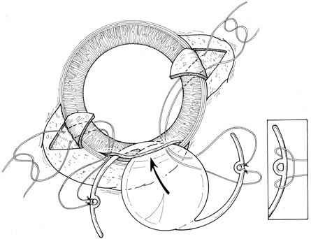 CORNEOSCLERAL LACERATIONS Corneal lacerations that extend past the limbus need careful examination to determine the full extent of the wound. Rectus bridle sutures of 4-0 silk or limbal fixation sutures of 6-0 silk may be used with caution if the globe is unstable. However, for large lacerations with structural deformation, sutures should be placed to restore wound integrity before rigorous exploration of the globe. Extreme care must be emphasized throughout the surgery to avoid iatrogenic damage. Initially, the limbus should be reapproximated with 8-0 or 9-0 nonabsorbable nylon or silk sutures to restore normal anatomic relationships. Any prolapsed or incarcerated iris should be repositioned, after which the corneal portion of the laceration is repaired as described earlier. The scleral laceration is then explored to ascertain the extent of damage. For smaller lacerations, a localized conjunctival peritomy is made to explore the wound. A 360-degree peritomy is made for larger lacerations to explore all quadrants. During exploration, care is always taken to avoid iatrogenic avulsion of intraocular contents. The use of loupes rather than the surgical microscope may facilitate the broader three-dimensional view required for repair of scleral laceration. As in the anterior segment, it is important to clear the wound of any prolapsed or incarcerated vitreous. Any prolapsed vitreous should be secured with dry cellulose sponges and cut flush with the sclera, avoiding traction on the vitreous. With good visualization, vitrectomy instrumentation may be used to remove vitreous at the wound. Should the wound extend through the pars plana, the vitrector may be placed intraocularly as long as visualization is good. If visualization is poor, or the lesion extends beyond the pars plana posteriorly, the vitrector should not be passed into the eye because this may create further damage to intraocular structures. There are many options in selecting suture material for scleral closure. Although some surgeons prefer nonabsorbable sutures (i.e., 8-0 nylon or silk), others may use absorbable materials (i.e., 7-0 polyglactin 910). For larger defects, nonabsorbable sutures should be used. When suturing gaping wounds, it may be helpful to advance the needle completely through one wound margin and then reload the needle holder before making a second pass, thus avoiding globe distortion (Fig. 17). For closing sclera over prolapsed uvea, the wound is often most easily closed from the anterior (limbal) end with interrupted sutures, which are placed successively, proceeding posteriorly. This is called the “zippering” or “close-as-you-go” technique. With this technique, sutures are placed in close proximity to one another in an attempt to achieve oversewing of the uveal tissue with the sclera. The surgical assistant may use a spatula to gently depress the uvea into the eye during suture tightening to avoid tissue incarceration during scleral closure (Fig. 18). Another suturing strategy is to successively bisect the wound while having the assistant use a spatula to press any prolapsed tissue back into the eye as sutures are tightened.