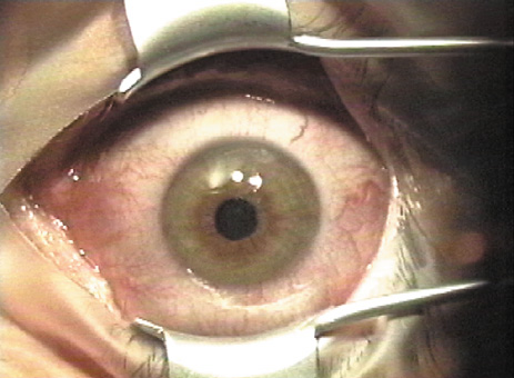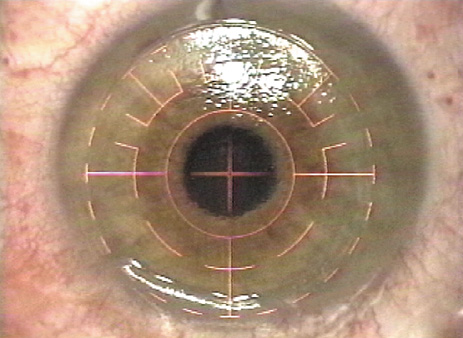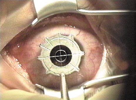 PREPARATION Prior to the LASIK procedure, the excimer laser beam is tested for proper homogeneity and fluence in an identical fashion to PRK preparation. The microkeratome and vacuum unit are assembled, carefully inspected, and tested to ensure proper function. The importance of meticulous maintenance of the microkeratome cannot be overemphasized. A new blade is placed within the microkeratome and, in models that permit different heads for different thickness flaps, the desired head size verified. The patient may receive a mild sedative such as oral diazepam 5 to 10 mg approximately 30 minutes prior to the procedure. Topical anesthetic drops are instilled and the skin is prepped with povidone iodine or another skin antiseptic. Some surgeons drape the skin or lashes with a plastic drape or Steri-Strips, whereas others feel this is unnecessary and a potential source of material to jam the microkeratome. A lid speculum is placed that has a configuration to accommodate the suction device and the path of the microkeratome (Fig. 2). The cornea may be marked with an optical zone marker to assist in proper centration of the suction ring and one or more periradial lines usually are placed to ensure proper realignment of the flap (Fig. 3).