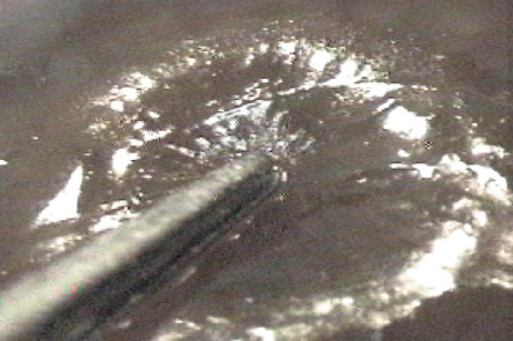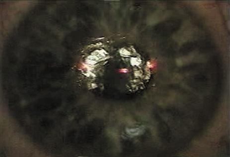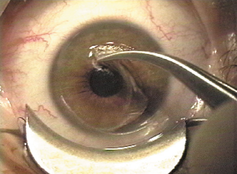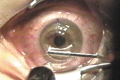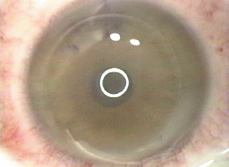 Prevention of epithelial defects is preferable to treatment. Key steps are: (a) careful preoperative screening for anterior basement membrane disease; (b) avoidance of toxic damage to the epithelium from anesthetics and drying; and (c) frequent administration of lubricants, particularly immediately prior to the microkeratome pass (Fig. 5). If a defect occurs, application of a bandage soft contact lens after completing the laser treatment and repositioning the flap is usually the best course. Administration of a potent broad spectrum antibiotic as infection prophylaxis and intense topical steroids to discourage diffuse lamellar keratitis (DLK) is advisable. The bandage contact lens is retained until the epithelial defect heals. For patients with a “slider” area of loose but intact epithelium, the surgeon is guided by the size and location of the sliding sheet to determine whether it is better to debride the loosened sheet or allow it to remain and try to re-establish adhesion. The patient with an epithelial defect needs to be informed about the condition and the expected slower recovery of vision. In occasional cases more intensive treatment is needed to re-establish integrity of the epithelium, even with the application of PTK (see Chapter XX). Free Cap Sporadically the microkeratome transects the hinge, creating a free cap rather than the desired flap. The two principal causes of free caps are either surgeon error in selecting the incorrect settings for the “stop” that controls the flap creation or an unusually small or flat cornea. A flat corneal curvature is a risk factor for development of a free cap.37 When the preoperative keratometry reading is 41 D or less in the meridian of the hinge, or the corneal diameter is under 11 mm, the surgeon should consider adjusting the microkeratome to create a slightly larger hinge or smaller diameter flap. If a free cap does occur, the most important initial action is to recognize that the flap is absent and stop the assistant from taking the microkeratome; the free cap is almost always adherent to the microkeratome head and the cap must be identified and recovered before it is lost (Fig. 20). The cap is placed in a sterile container, preferably closed to reduce desiccation. The laser procedure is completed if the exposed stromal bed is large enough for the laser ablation, and then the cap is repositioned. The use of gentian violet ink alignment marks aids in identification of the epithelial side as well as correct repositioning of the flap. Although some surgeons have success simply allowing a free cap to adhere naturally, many surgeons feel more secure placing a suture to perform the function of the hinge. Usually a 10-0 nylon suture is employed as a single interrupted stitch. The suture must not be tight; tension distorts the flap and creates irregular astigmatism. If the flap is secure on the first postoperative day it is usually safe to remove it at that visit. Some surgeons also use a bandage soft contact lens to assist in stabilizing the cap.