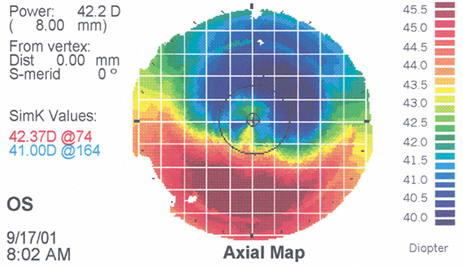 In its premarket approval application to the Food and Drug Administration, Alcon Autonomous compared the effectiveness of 139 eyes with wavefront-guided Custom ablations to 47 conventionally treated eyes at 6 months after surgery. All eyes had a preoperative myopic manifest refractive error under −7.0 D sphere and under 0.5 D cylinder. Seventy-nine point nine percent of wavefront-treated eyes achieved UCVA of 20/20 or better, 91.5% 20/25 or better, and 98.6% 20/40 or better. The manifest refraction spherical equivalent (MRSE) was ±0.5 D in 74.8% and ±1.0 D in 95.7%. Aberrations were smaller at 6 months than preoperatively for 38% of Custom eyes compared to 14% of a healed flap edge by RMS increased by 0.08 μ (20%) in the Custom group and 0.33 μ (82%) in the conventional group. Spherical aberrations increase by 0.04 μ (22%) for Custom eyes and 0.23 μ (108%) for conventional eyes. No Custom patients reported “significantly worse” glare or haloes postoperatively and only one patient reported significantly worse night driving difficulty. Mean contrast sensitivity for Custom eyes improved by 0.1 to 0.2 log units relative to conventional eyes. Best spectacle-corrected vision (BSCVA) and low-contrast acuity were both slightly better for Custom eyes than conventionally treated eyes. More Custom eyes showed clinically significant increase than decreases, whereas more conventional eyes showed clinically significant decreases than increases in both of these measures. A single site comparison of the Alcon Custom Cornea and the Bausch and Lomb Zyoptix systems, reporting results at 1 month, showed similar excellent results, such as 93% and 90% rates of 20/20 UCVA and 80% and 70% 20/16 UCVA, respectively.61 A single site comparison of Alcon Custom Cornea and VISX Custom Vue for eyes under −8 D and cylinder under 1.5 D yielded 98% and 95%, respectively, within 0.5 D of target.62 In a contralateral eye study, after a nomogram adjustment, the Alcon Custom Cornea and VISX Custom Vue results were 80% and 100%, respectively, within 0.5 D of goal.63 The use of wavefront-guided treatments is FDA approved for primary treatments only, but this technology is attractive for enhancements of patients with vision disturbances attributable to aberrations.64 As an example, Figure 18A shows the corneal topography of a decentered ablation with loss of BCVA and complaints of glare. The wavefront measurement showed a large amount of coma, consistent with the decentration (Fig. 18B). The patient received a wavefront-guided enhancement. Marked improvement occurred, with improved BCVA, resolution of most vision complaints, and improvement in the corneal topography (Fig. 18C) and reduction in the amount of aberration (Fig. 18D). |