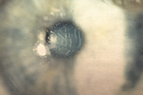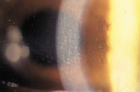 Persistent optically significant striae must be addressed, nonetheless. Many interventions have been recommended with variable results. Some surgeons advocate hydration of Bowman's layer. Although this eventually occurs with prolonged stroking of the epithelial surface with a moistened surgical spear sponge or irrigating cannula, microstriae usually disappear within minutes of deliberate de-epithelialization of the area over the microstriae, followed by several drops of sterile distilled water. Hypotonic solution applied directly to the Bowman layer speeds the disappearance of the microstriae. If the striae persist, then the flap should be lifted and the interface irrigated with balanced salt solution to allow the flap to reposition. In severe cases, traction with fine tooth forceps or suturing as described for macrostriae also may be helpful. Care must be taken not to tear the fragile flap. A bandage soft contact lens then is applied with antibiotic and mild steroid until re-epithelialization is established. An alternative to these procedures is phototherapeutic keratectomy (PTK). Pulses from a broad-beam laser, set to a maximal diameter of 6.5 mm, are applied initially to penetrate the epithelium in about 200 pulses. The epithelium acts as a masking agent, exposing the elevated striae before the valleys between the striae. After the transepithelial ablation, additional pulses are applied with the administration of a thin film of medium viscosity artificial tears every five to 10 pulses, up to a maximum of 100 additional pulses. If these guidelines are followed, little to no haze results and an average hyperopic shift of under +1 diopter occurs, because of the minimal tissue removal. Steinert, Ashrafzadeh, and Hersh demonstrated significant improvement in BCVA and lack of optically significant haze with this technique.77 The principles and techniques of PTK for reduction of corneal surface irregularities are discussed in more detail elsewhere in this volume. CENTRAL ISLANDS AND DECENTRATION Irregular astigmatism can be induced by complications related to the laser ablation. The fluence and homogeneity of the laser must be checked before the procedure to assure that there is a smooth ablation profile without “hot spots” or “cold spots.” Central islands can occur after LASIK just as they do after PRK, but the incidence after LASIK is significantly lower. The etiology of central islands after LASIK is not fully understood but evidence points to vortex currents in the center of broad beam ablation, central accumulation of fluid or debris during the ablation, or patient healing responses.78,79 Central islands can be avoided sometimes with the use of anti-island software in which more pulses are delivered to the center of the ablation zone. If a central island does occur and does not resolve on its own, it can be treated with the excimer laser by lifting the flap and applying a central ablation to the elevated island. Another potential source of irregular astigmatism related to the laser application is a decentered ablation. Mild decentrations often are asymptomatic, but larger decentrations can lead to significant optical aberrations that can be difficult to treat. Until recently, decentration has been addressed by further ablation with opposite decentration,80–82 or through arcuate keratotomies and limbal relaxing incisions.83 Wavefront measurements may be able to more directly and precisely direct enhancement retreatments to improve the optical disruptions caused by decentrations, which particularly induce the aberration known as coma.84 (See the earlier discussion on outcomes and enhancements in the preceding.) INTERFACE INFLAMMATION Sterile interface inflammation has been referred to as “Sands of the Sahara,”85 diffuse lamellar keratitis (DLK),86 or, perhaps most accurately, diffuse interface keratitis (DIK).87 This syndrome can range from asymptomatic interface haze near the edge of the flap to marked diffuse haze with diminished best-corrected vision. DLK is clinically staged depending on severity. Stage 1 is a barely visible fine dusting of white blood cells in the interface, often just in the periphery. In stage 2, the cells are more easily seen, and often accumulate in the ridges caused by microkeratome blade chatter, giving the characteristic parallel lines that look like windswept desert sand (Fig. 24A). Stage 3 is reached when the density of inflammatory cells begins to interfere with visualizing intraocular details (Fig. 24B). If the release of collagenase occurs with haze, softening, or loss of stroma and onset of large wrinkles, DLK is in stage 4 (Fig. 24C).