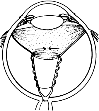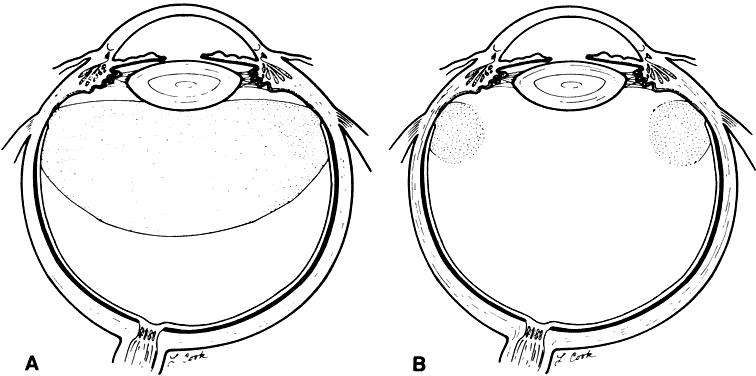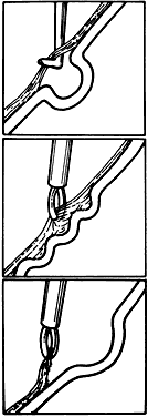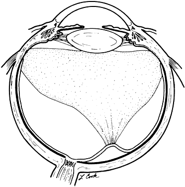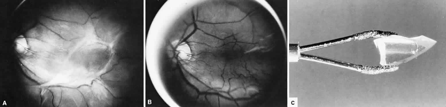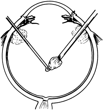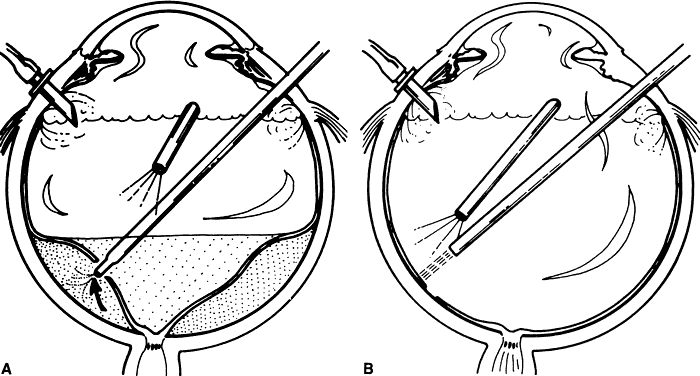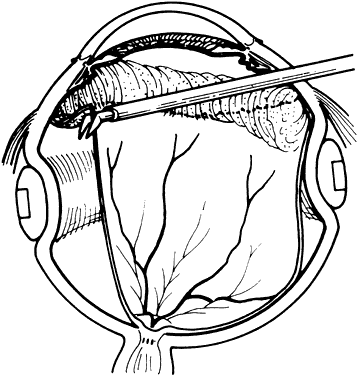 PVR occurs in 5% of all retinal detachments when retinal pigment epithelial cells, glial cells, or bothproliferate on both surfaces of the retina and on vitreous membranes. Signs of PVR include fixed folds, detachment of the nonpigmented epithelium of the pars plana, and equatorial folds. Preretinal and subretinal membranes cause shortening of the retina (Fig. 23). If a higher scleral buckle does not close the retinal breaks, release of traction is essential for reattachment. The first step is to search carefully for any open retinal breaks. In recurrent retinal detachment, look at the original break or breaks first. In reoperations for PVR, breaks on the posterior slope of a previously placed buckle at the edge of a cryotherapy scar account for 40% of all new or previously identified breaks.89 The vitrectomy instrument is used to remove as much formed vitreous as is safely possible and to cut transvitreous membranes, releasing vitreous traction. Bent needles or forceps are used to peel preretinal membranes from the retinal surface to restore retinal flexibility (Fig. 24).
