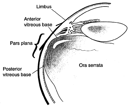 ANCILLARY TESTING Ultrasonography is an invaluable tool in evaluating eyes with opaque media. Ultrasound can aid in diagnosing vitreous membranes, retinal detachments, intraocular foreign bodies (IFBs), perforating injuries, choroidal detachments, intraocular tumors, and so forth accurately. It is important to recognize the distinctive funnel-shaped pattern that identifies retinal detachment with severe proliferative vitreoretinopathy (PVR).41 Such detachments are challenging and may require more advanced vitreoretinal techniques. Ultrasound in trauma cases also provides prognostic information. Eyes undergoing vitrectomy after penetrating trauma fared worse if preoperative ultrasound detected retinal detachment,subretinal blood, massive choroidal detachments, or posterior exit wounds.42 Ultrabiomicroscopy is a recent ultrasound imaging technique that provides a high-resolution view of the anterior segment. In recurrent vitreous hemorrhages after diabetic vit-rectomy, ultrabiomicroscopy can evaluate the sclerotomy sites for possible neovascularization.43,44 In eyes with opaque media, there also are tests that can assess gross retinal and optic nerve function. Color perception, two-point discrimination, and Maddox rod orientation are of limited value.45 The perception of entoptic phenomenon to assess retinal function has had mixed results.21,45,46 The basis for the blue-field entoptic phenomenon is that patients with normal maculae who stare at a diffuse blue-light can see leukocytes circulating in their macular capillaries. An instrument with a blue light bright enough to penetrate dense vitreous hemorrhage is available. It can predict macular function successfully in patients with traumatic vitreous hemorrhage but, in general, is rarely used in clinical practice.46 Electroretinography (ERG) helps to evaluate the overall functional status of the retina. The standard Grass photostimulator may not provide enough light to stimulate the retina in cases of dense vitreous hemorrhage. The resultant flat tracing may falsely indicate a nonfunctioning retina. However, the bright-flash ERG can penetrate dense vitreous hemorrhages. Some of the light actually transverses the sclera to stimulate the retina. Nevertheless, the ability of a preoperative bright-flash electroretinogram to predict visual outcomes is controversial. A patient may have an excellent visual result after removal of a diabetic vitreous hemorrhage but have a flat preoperative ERG. A decision to operate should not be based on a preoperative ERG as it cannot safely predict the outcome in diabetic vitrectomy.47,48 Focal macular electroretinograms recently have been used before and after surgery in select macular conditions.49,50 Other electrophysiologic tests to evaluate visual function are pattern and flash visual-evoked potentials (VEPs). The pattern VEP evaluates macular function and is not useful in patients with opaque media because the pattern cannot be perceived.51 A normal response to a flash VEP depends on a normally functioning retina and optic nerve. A bright flash is not essential to generate the VEP because this test does not require as much light as does the ERG. Both the latency and amplitude of the tracing provide useful information.52 If the retina is totally detached, the VEP is absent. If it is partially attached, the VEP is reduced. A delayed VEP indicates optic nerve dysfunction. The amplitude of the flash VEP at stimulus rates of 10 flashes per second is largely influenced by the macular status. At 20 to 30 flashes per second, the amplitude depends more on the integrity of the optic pathways. Therefore, the VEP may be an excellent predictor of postoperative visual acuity. However, the prognostic value of a preoperative flash VEP for a diabetic vitrectomy is controversial. Similar to ERG, a decision to operate should not be based on a preoperative VEP as patients may obtain good vision despite a reduced VEP.47,48 Computed tomography scans have been shown to be helpful in localizing foreign bodies in or near the sclera. Computed tomography and ultrasound are more sensitive techniques than are plain x-ray films for detecting and localizing IOFBs.53,54 The sensitivity of computed tomography scan for detecting IOFBs is 100% for objects larger than0.06 mm.55 Magnetic resonance imaging is contraindicated in IOFB cases because of potential movement of magnetic IOFBs by the powerful magnetic resonance imaging magnets. A new technique that is helpful in preoperative assessment of patients is optical coherence tomography, which is a noncontact, noninvasive imaging technique that produces high-resolution, cross-sectional images of the retina.56 The interaction between the posterior hyaloid and the retinal surfaces can sometimes be difficult to discern. Optical co-herence tomography can assist in diagnosing vit-reomacular traction syndrome and distinguishingfull-thickness holes from pseudoholes, cysts, and partial-thickness holes.57–59 This technique also can be used to assess macular hole closure after vitrectomy and macular edema before and after vitrectomy for diabetic macular edema.60–62 SURGICAL ANATOMY It is essential to be familiar with the surgical anatomy when performing a vitrectomy. The pars plana, the posterior section of the ciliary body, is the entry site to the vitreous cavity for ocular instruments in pars plana vitrectomy (PPV). The pars plana is around 4 mm wide in adults and is nded anteriorly by the pars plicata (ciliary processes) and posteriorly by the ora serrata. In adults, the ora serrata is 6 to 7 mm posterior to the limbus nasally and 6 to 8.5 mm temporally.63 In phakic patients, the pars plana should be entered 4 mm posterior to the limbus and in pseudophakic patients 3 to 3.5 mm posterior to the limbus (Fig. 3). This technique ensures that the entry of the ocular instruments will be anterior to the ora serrata to prevent a retinal tear or detachment and posterior to the well-vascularized pars p