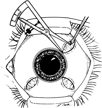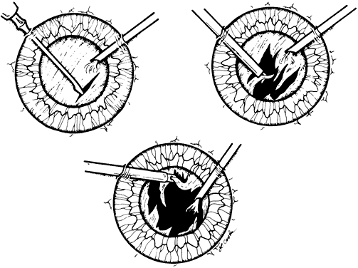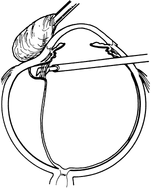 Small radial or triangular incisions through the conjunctiva and Tenon's capsule are made superonasally, superotemporally, and inferotemporally. Hemostasis is maintained with bipolar diathermy. The entry incisions are parallel to the corneoscleral limbus and are 4 mm posterior to it in phakic eyes and 3 to 3.5 mm in aphakic and pseudophakic eyes (Fig. 6). The incisions are made with a 20-gauge microvitreoretinal (MVR) blade. It is important that the incisions (through the sclera, uvea, and pars plana) be just large enough to permit entry of the desired instrument. A 1.4-mm linear incision rounds out to 0.89 mm, the diameter of the blade shaft.78 If the incisions are too long, irrigation fluid leaks around the instrument and out of the eye, making normal intraocular pressure (IOP) difficult to maintain without using large volumes of irrigating solution. In addition, if a total gas-fluid exchange is later attempted, the gas escapes from the eye. All blades used for incisions must be sharp, so that when introduced into the eye, they do not push pars plana epithelium or vitreous base ahead of them, causing a retinal tear or dialysis. The MVR blade should be held at an approximately 70-degree angle and passed toward the optic nerve. It is important to enlarge the sclerotomy incision from the inside out to ensure that the internal opening is as large as the scleral opening (Fig. 7). When the media are clear, the surgeon should push the MVR tip into the eye until it can be seen through the pupil. The first incision is for the infusion cannula, which is placed in the inferotemporal quadrant, just inferior to the lateral rectus muscle. If the cannula is placed too far inferiorly, it presses against the lid speculum during inferior rotations of the globe and may hinder access to the inferior portions of the eye. A 5-0 nylon mattress suture, which secures the base of the infusion cannula, is placed before entering the eye (Fig. 8). In most cases, a 4-mm cannula is used. In pseudophakic/aphakic eyes, a6-mm cannula can be used to assist in visualization of the cannula tip in cases of media opacity. The infusion cannula is twisted through the sclerotomy site in an oscillatory fashion, ensuring the bevel is facing the center of the eye. The surgeon, using the indirect ophthalmoscope if necessary, must verify that the cannula has passed cleanly through the pars plana epithelium before turning on the infusion.79 A small pupil may hinder the view of the cannula and the subsequent surgery. Flexible iris retractors are an easy and effective way for enlarging a small pupil (Fig. 9).14 If there are opaque media, the surgeon must provide infusion with a hand-held infusion needle whose tip can be seen until the media are clear enough to see the cannula. It is difficult to place an infusion cannula into the vitreous cavity if there is a choroidal detachment. The safest technique is to drain the detachment while maintain-ing the intraocular volume with irrigating solution through a 22-gauge needle.80 The needle is introduced through the limbus in aphakic eyes and through the pars plana in phakic eyes.