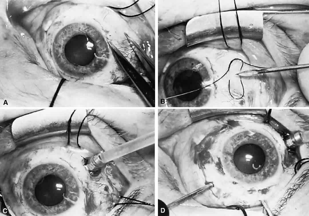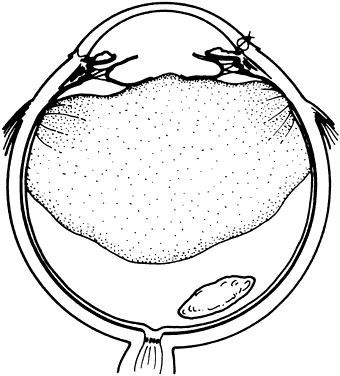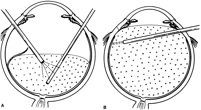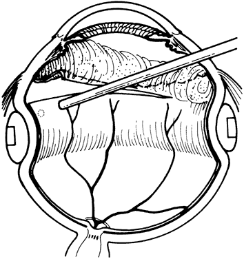 Once the media are cleared and anteroposterior traction has been removed, attention can be turned to the specifics of the case. After the case is completed, the sclerotomy sites should be closed temporarily and the periphery inspected for any breaks or detachments. Regardless of the indication for surgery, inspection should be performed before any gas or air injection in the eye as small breaks may be missed under partial or complete air- or gas-filled eyes. The sclerotomy sites also should be inspected carefully for any retinal or vitreous incarceration. The sclerotomy sites are closed with 7-0 polyglactin (Vicryl) sutures in a figure-eight configuration. The IOP should be checked. If the eye is soft, BSS can be injected at the pars plana or limbus to repressurize the eye. The conjunctiva is closed with 8-0 Vicryl sutures. Subconjunctival injections of a steroid and antibiotic are placed inferiorly, away from the rectus muscles. |