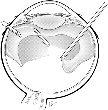 PPV is a bimanual technique. Typically, one sclerotomy port is used for a fiberoptic light source and the other sclerotomy for the vitrector or other instruments. Vitrectomy instruments should be held lightly in the surgeon's fingertips. It is important to position the instruments at the correct angle to avoid damaging the lens when entering the eye. The initial goals of the vitrectomy are to clear the axial media and to remove anteroposterior vitreoretinal traction. If there are media opacities, they should be removed from the central vitreous (Fig. 13). The status of the posterior hyaloid must be noted. If there is a complete posterior detachment, an edge of the posterior hyaloid should be followed out to the periphery circumferentially (Fig. 14). If there is a partial posterior detachment, the posterior hyaloid should be incised over attached retina and away from the macula. The incised edge should then be followed circumferentially. If there is preretinal blood, it can be removed with the vitrector on suction or with an extrusion cannula (Fig. 15). If the hyaloid is completely attached, the central vitreous should be removed with the cutter. Application of active suction with the vitrector or soft-tipped extrusion cannula over the optic nerve head should elevate the posterior hyaloid face. The soft-tippedcannula bends with engagement of the posterior hyaloid, which is called the fish-strike sign (Fig. 16). The elevated hyaloid can be incised with the cutter and an edge followed out to the periphery circumferentially.