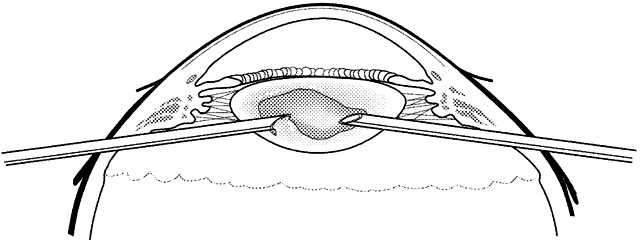 the vitreous hemorrhage.157,158 An axial shallowing of the anterior chamber, a patent iridectomy, and the absence of suprachoroidal hemorrhage (SCH) or fluid define malignant glaucoma. The IOP usually is elevated but can be normal. The pathogenesis is unknown but may involve posterior flow of aqueous humor into the vitreous cavity, which increases vitreous volume and causes shallowing of the anterior chamber.159 This condition usually occurs after surgery and often is controlled with cycloplegics and aqueous suppressants or laser disruption of the anterior hyaloid face. However, in refractory cases, PPV has been shown to be effective in restoring a deep anterior chamber and normal IOP.160,161 The theory is that the anterior hyaloid face is disrupted during surgery, which restores the normal flow of aqueous into the anterior chamber. In certain refractory cases of glaucoma such as NVG, a combined approach with a glaucoma tube shunt procedure and PPV has been shown to be effective.162–165 PPV is used to clear media opacities such as vitreous hemorrhage in NVG or address multiple problems such as glaucoma and retinal detachment in one operation. Pars plana place-ment of a drainage implant may be necessary forpatients with anterior chamber abnormalities ormarked neovascularization. Recently, a pneumatically stented Baerveldt implant was designed specifically for pars plana insertion.166 DISLOCATED LENS FRAGMENTS AND LENSES Vitrectomy techniques have been shown to be helpful in removing spontaneously dislocated lenses, in removing nuclei and cortex dislocated during cataract surgery, and in retrieving and positioning posteriorly dislocated IOLs.86,167–176 Large lens fragments, nuclear fragments, glaucoma, significant uveitis, and corneal decompensation are indications for PPV and removal of posterior retained lens fragments. The timing of the intervention is controversial, but several large studies have not shown significant differences in outcome in early (less than 1 week) and delayed (up to 2 weeks) vitrectomy for retained lens fragments.173,176 A lens implant, if not placed during the original operation, can be placed safely during the vitrectomy. Recent studies of vitrectomy for retained lens fragments have shown 20/40 or better visual acuity in almost 70% of patients.174,176,177 PUPILLARY MEMBRANES Neodymium:YAG (Nd:YAG) capsulotomy is the best procedure for thin pupillary membranes. However, a partial membranectomy with a vitrectomy instrument may be indicated for dense or recur-rent membranes. The instrument can be insertedthrough the corneoscleral limbus. The anterior chamber is kept formed by a separate infusion line attached to a bent needle. The newer vitrectomy instruments are capable of cutting most membranes if the membrane is flexible enough to be sucked into the cutting port. Beginners often make the error of pushing the instrument tightly against the membrane (Fig. 36). This only results in stretching it even tighter and reducing the likelihood of sucking it into the port. Better results are achieved if the cutting port is held just below the membrane, giving the suction a better chance to pull the membrane into the cutting port. Inflexible membranes must be sectioned with scissors or torn with a bent needle before removal (Fig. 37).