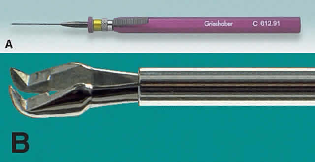 Membrane segmentation is used to relieve tangential retinal traction by cutting membranes, which are interconnected and producing retinal traction (Fig. 26). This technique does not involve the removal of membranes but after segmentation, membrane peeling and delamination may be easier to perform. Segmentation usually is performed with vertical scissors, which can be automated or manual (Fig. 27). To prevent intraoperative bleeding, fibrovascular membranes should be treated with diathermy before they are cut. If vessels are cut inadvertently, they should be diathermized promptly after occluding them by raising the IOP.