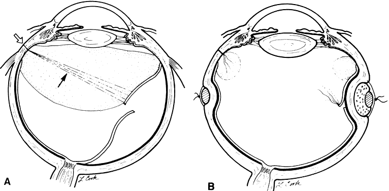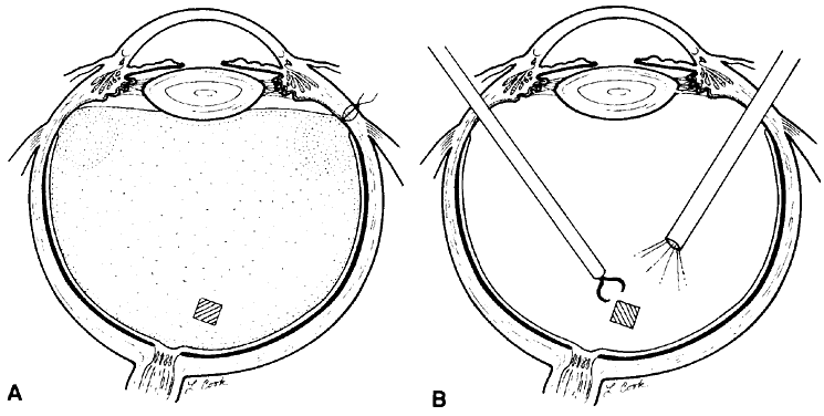 The prognosis for IOFB is relatively favora-ble.249–251 In the study by Greven and associates,251 71% of patients achieved a visual acuity of 20/40 or better. Factors that portent a poorer prognosis include poor initial visual acuity, larger wounds (over 4 mm), and vitreous hemorrhage.249 Penetrating BB-gun injury carries a poor prognosis.250,252 Traumatic endophthalmitis and IOFBs are the current indications for prompt vitrectomy. Otherwise, the timing for vitrectomy after closure of the ruptured globe is controversial. At Wills Eye Hospital, we typically intervene 7 to 10 days after the initial repair for retinal detachments, choroidal hemorrhages, and vitreoretinal traction. At 7 to 10 days, there is a higher chance for the development of a posterior vitreous detachment, which facilitates surgery. The risk of intraoperative hemorrhage is less than if earlier intervention is performed. In addition, the delay in surgery allows for liquefaction of SCH, if present. Finally, experimental evidence indicates that a vitrectomy performed within 2 weeks of severe injuries prevents later traction retinal detachment.253,254 In surgery, an anteroposterior approach is taken. Hyphema evacuation, lensectomy, and drainage of choroidals are performed. Next, a vitrectomy is done to clear the media. If epiretinal membranes are present, they should be removed. A retinotomy may be needed for retinal incarceration or PVR. If peripheral breaks are present, one may consider a scleral buckle with or without an encircling element. All breaks should be surrounded with cryotherapy or laser. PFCLs may assist in retinal reattachment. Long-acting gases or SO should be used for postoperative tamponade. ENDOPHTHALMITIS Vitrectomy has shown to be of benefit in acute endophthalmitis (less than 6 weeks) after cataractsurgery. The Endophthalmitis Vitrectomy Study (EVS) was a randomly assigned, prospective clinical trial evaluating treatment strategies for acute endophthalmitis after cataract surgery or secondary IOL surgery.255 The EVS compared treatment outcomes of intravitreous antibiotics with either immediate PPV or vitreous tap/biopsy and also evaluated the value of intravenous antibiotics. All groups received intravitreous, subconjunctival, and topical antibiotics. The EVS treatment outcomes showed that there was no significant difference in visual acuity or media clarity outcomes, whether systemic antibiotics were administered. The study also showed that only patients with vision LP or worse benefited from vitrectomy. In this subgroup, 33% of patients undergoing vitrectomy and intravitreous antibiotics had 20/40 visual acuity or better versus 11% of patients undergoing vitreous tap with injection of intravitreous antibiotics. In this subgroup, vitrectomy reduced the rate of severe visual loss from 47% to 20%. However, if the vision was hand motions or better, there was no treatment difference between vitrectomy/intravitreous antibiotics and vitreous tap/intravitreous antibiotics.255 The choice between vitreous tap/biopsy versus vitrectomy foracute postoperative endophthalmitis is based mainlyon the presenting visual acuity put forth in the EVS group publications. The results of the EVS should not be extrapolated to cases of delayed-onset or endogenous endophthalmitis. Several recent reports suggest that vitrectomy, capsulectomy, and intravitreous antibiotics is the best initial approach for chronic endophthalmitis.256,257 Similarly, cases of endogenous endophthalmitis with moderate-to-severe vitreous involvement may benefit from initial vitrectomy.258,259 As discussed above, prompt surgical intervention for IOFBs is indicated and may reduce the incidence of endophthalmitis.260 UVEITIS Cataract is a common late complication of severe uveitis. In addition, the vitreous may be opacified by numerous vitreous cells and dense membranes. Some surgeons believe that the best results are obtained with a combination pars plana lensectomy and vitrectomy,261 but good results have been reported with cataract surgery alone.262 In most cases, a posterior chamber lens can be placed.263 All authors stress, however, the necessity of intensive preoperative and immediate postoperative corticosteroid therapy to diminish the inflammatory response to the surgery. Severe inflammation as seen in Toxocara canis vitreoretinal abscesses may cause strong vitreous traction resulting in traction retinal detachment or dragged macula. Vitrectomy is the procedure of choice to prevent these complications.264 VIRAL RETINITIS-RELATED RETINAL DETACHMENTS Herpes-family viruses can cause extensive retinitis and secondary retinal detachments. Cytomegalovirus is seen almost exclusively in immunocompromised patients, whereas herpes simplex or herpeszoster is seen in both immunocompetent and immunocompromised patients. The term acute retinal necrosis (ARN) has been used to describe this type of viral retinitis in immunocompetent patients. These types of retinitis have in common the high propensity of patients to have multiple posterior retinal breaks develop during the healing phase of the disease. Retinal detachments have been reported to occur in up to 50% of cytomegalovirus retinitis cases265 and in 50% to 75%266,267 of ARN cases. PVR usually is not seen in these detachments except for ARN in immunocompetent patients. These detachments typically are repaired with PPV and SO tamponade, especially if the retinitis has been extensive and retinal holes numerous.139 In cytomegalovirus detachments, recent studies have shown more encouraging results.140,268 In the study by Lim and associates,140 71% of patients treated with vitrectomy and SO achieved 20/200 or better visual acuity. Primary vitrectomy in retinal detachments with ARN appears to offer the best prognosis because the breaks are multiple and posterior and PVR often is present. In one study of ARN detachments, there was a 94% final anatomic success rate.269 VITREOMACULAR TRACTION Abnormal vitreoretina