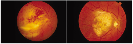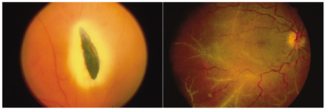 The choice of systemic antifungal agents is based on several factors.27,114 For example, if there is no evidence of disseminated disease or if patients are too ill to tolerate the toxicity associated with systemic amphotericin B, other less toxic systemic oral antifungal medications can be used. This is usually administered in conjunction with an infectious disease consultant. When Aspergillus infection is suspected, aggressive local ocular therapy including vitrectomy and intravitreal amphotericin B is usually indicated.25 Successful treatment in Aspergillus endophthalmitis cases can be accomplished, but the occurrence of a macular abscess may reduce central vision on a permanent basis (Fig. 15). Because an intraocular Aspergillus infection is frequently associated with other organ involvement, particularly cardiac valve vegetation, a comprehensive systemic evaluation is mandatory, and systemic therapy is indicated in most cases. Endogenous bacterial endophthalmitis is felt to be less common than fungal endophthalmitis. In a 10-year retrospective study of 28 bacterial cases at the Massachusetts Eye and Ear Infirmary,26 the fol1owing organisms were most frequently isolated: S. aureus 25%, Escherichia coli, 18%, and Streptococcus species 30%. Sources of infection were identified in 90% of cases. Endocarditis and the gastrointestinal tract were the most common sources. In a retrospective review of 72 cases of endogenous endophthalmitis from multiple sources, one report reviewed the spectrum of causative bacteria and showed B. cereus as the most frequently reported bacterial agent.23 This high incidence of endogenous Bacillus endophthalmitis was due to its association with intravenous drug abuse. This report also showed an increasing incidence of infections by organisms of low pathogenicity in immune-compromised hosts. The authors of this series proposed a classification scheme for endogenous endophthalmitis based on the location (anterior or posterior segment) and extent (focal or diffuse) of the primary intraocular infection. Focal and anterior cases appear to have a better visual prognosis, while posterior diffuse disease nearly always leads to significant loss of vision.23 To diagnose endogenous bacterial endophthalmitis, a high index of suspicion is important. All patients with visual loss and progressive intraocular inflammation should undergo indirect ophthalmoscopy looking for evidence of septic foci in the posterior segment. In some cases, the established intraocular inflammation is the initial finding leading to the diagnosis of bacterial endocarditis and sepsis. As with endogenous fungal endophthalmitis, an internist or infectious disease specialist should be involved in both the systemic workup and medical therapy. Some patients will present with a known site of infection. In these cases, the intraocular organism is almost always the same as that cultured from the other organ site. These findings will help guide the selection of appropriate antibiotic therapy for both the systemic and ocular infection. In cases without a known site of infection other than the eye, a systemic laboratory workup that includes cultures of blood, urine, sputum, and other suspicious sites should be obtained. Systemic antibiotics are often used to treat of endogenous endophthalmitis. In cases with focal chorioretinitis but without marked vitreous infiltrates, systemic therapy alone may achieve involution of the lesions. In eyes that fail to respond to systemic antibiotic therapy alone, intraocular therapy may be beneficial. When severe vitritis or marked vitreous infiltrates are present, a vitrectomy and intraocular antibiotic injection are usually recommended.114 |
