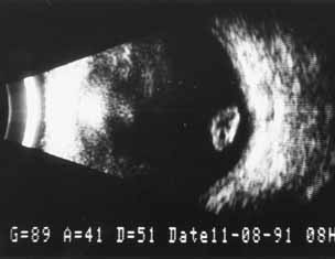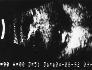 chamber. Despite these potential problems, early evaluation of the posterior segment is invaluable in assessing retinal complications after surgery and determining the timing of definitive surgery. Frequently, the view is compromised because of corneal edema, miotic pupils, and lens particles. Ultrasonography can readily identify the amount of nuclear and cortical material present in the posterior segment. Cortical material typically produces a snowstorm appearance on ultrasonography, with larger pieces demonstrating irregular borders deposited inferiorly (Fig. 1). Nuclear material typically is found inferiorly and not suspended in the vitreous and is acoustically denser with more regular borders (Fig. 2). Ultrasonography can also identify areas or vitreal-retinal traction, retina tears, or retina detachment not otherwise easily discernable on funduscopic examination.