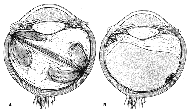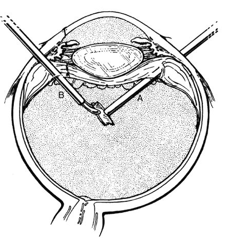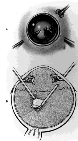 hemorrhage, retinal breaks, and retinal detachment. SUBLUXATION OR DISLOCATION OF THE LENS Minor degrees of subluxation should be suspected when phakodonesis or iridodonesis is noted. Zonular rupture is certain if there is vitreous prolapse into the anterior chamber. In the absence of cataractous changes and related visual impairment, treatment is not indicated. A subluxated, cataractous lens can be removed by aspiration-irrigation or phacofragmentation through a limbal incision, but complications may occur, including posterior dislocation of the lens or lens fragments, vitreous prolapse and incarceration, and vitreous aspiration with resultant vitreous base traction and retinal tear formation. Also, visualization of the anterior vitreous by coaxial illumination is poor compared with fiberoptic endoillumination. These problems make pars plana lensectomy an attractive alternative. Bimanual techniques permit fixation and simultaneous removal of the lens by the vitreous suction-cutter, if the lens is soft, or phacofragmentation if it is sclerotic (Fig. 1A). Posteriorly dislocated fragments can be removed safely, with minimal vitreous traction, using the same incisions and instruments (see Fig. 1B). With endoillumination, prolapsed and juxtalenticular vitreous is readily identified and excised with the vitrectomy probe. Without question, pars plana lensectomy is the preferred method for removing a completely dislocated lens. The technical aspects of dislocated lens and lens fragment removal are described elsewhere in these volumes. VITREOUS HEMORRHAGE Blood in the vitreous may come from tears in the iris, ciliary body, choroid, or retina. Hemorrhage from choroidal ruptures accumulates beneath the neurosensory retina; it then passes through the retina into the vitreous without necessarily causing a retinal break. Regardless, it is important to assume that a retinal break is present until proved otherwise. Vitrectomy is indicated for vitreous hemorrhage caused by ocular contusion when a retinal detachment is suspected because of sudden additional loss of vision, when a retinal detachment is detected through a window in the hemorrhage, when a large retinal break or retinal detachment is diagnosed by ultrasound, or when there is no improvement after a reasonable period of observation. Preoperative contact A-scan and B-scan ultrasonography is helpful for detecting posterior vitreous detachment and differentiating it from retinal detachment. It is dangerous, however, to rely completely upon the accuracy of ultrasound. The presumed posterior hyaloid should be approached with caution until it can be identified with certainty. A standard three-port vitrectomy technique is preferred for nonclearing vitreous hemorrhage. Initially, a central core of opaque vitreous is removed, beginning sufficiently close to the lens that the tips of the cutter and endoilluminator can be visualized. The excision is carried posteriorly, removing successive layers of hemorrhagic and fibrinous vitreous, until the anticipated plane of the posterior hyaloid is approached. A constant surveillance is maintained for a gray membrane containing radially oriented vessels (undiagnosed detached retina). A small opening is made in the detached posterior hyaloid, through which unclotted blood is aspirated by use of active suction from a soft-tipped cannula. Once the retina has been visualized, it is best to remove as much retrohyaloid blood as possible to prevent dispersion into the vitreous cavity with consequent loss of visual control. If the posterior vitreous cortex is not detached, it can be separated from the retina by gentle suction with a soft-tipped cannula at the edge of the optic disc. The elevated cortex is penetrated with a hooked needle or myringotomy blade, creating a window through which a pick is introduced to enlarge the area of cleavage. With the plane between hyaloid and retina established, the surgeon attempts to remove the entire cortical vitreous except for the firmly attached portion at the anterior vitreous base. Cortex that does not separate with gentle manipulation is isolated from surrounding vitreous to eliminate traction on the retina. It is important to remove the cortical vitreous from areas adjacent to retinal breaks. Failure to do so may result in subsequent tangential traction and retinal detachment. A scleral buckle should be considered if retinal breaks cannot be freed from surrounding vitreous cortex. The placement of sclerotomies close to the 3 o'clock and 9 o'clock positions facilitates maximal excision of the hemorrhagic anterior vitreous skirt, thereby improving visualization of the peripheral retina and pars plana. With use of coaxial illumination and scleral depression, the peripheral vitreous on the temporal side of the globe is trimmed with the cutter placed in the temporal sclerotomy, reaching both the superior and inferior quadrants, after which it is transferred to the nasal sclerotomy, and the process is repeated. The fiberoptic endoilluminator may damage the lens if used internally to illuminate the peripheral vitreous on the opposite side of the globe. However, the cone of light from the probe may be directed through the cornea to augment or replace the coaxial light source. Hemorrhagic retrolenticular vitreous can be stripped from the posterior capsule of the lens by gentle aspiration into the cutting port followed by withdrawal of the probe and simultaneous activation of the cutting mode. This technique is dangerous in young children because the retrolenticular vitreous is adherent to the lens, which is sufficiently pliable for aspiration into the port with consequent cataract formation. When the lens is clear, the process of removing peripheral and retrolenticular vitreous is less important than preserving lens integrity in most cases. It is important to expose the peripheral retina and vitreous base because most retinal breaks caused by ocular contusion are located in this area.2