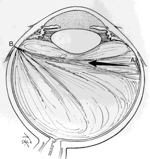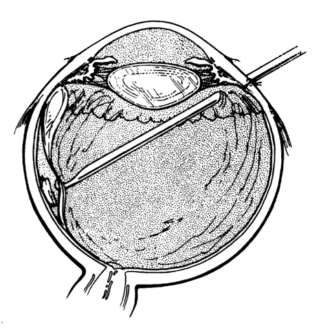 visual acuity of 0.1 from 29% in the 1930s to 67% in 1991.10–12 TERMINOLOGY To avoid confusion, penetration, in this chapter, is defined as a partial cut, tear, or passage through a structure. The term perforation implies complete cutting, tearing, or passage through the referenced structure. Therefore, a corneal laceration is a perforation of the cornea and a penetration of the globe. A foreign body that passes into and out of the eye perforates the globe, but such injures are frequently called double-penetrating, double-perforating, or through-and-through injuries. PATHOGENESIS The etiologies and, therefore, the mechanisms of damage of penetrating injuries are highly variable. They cause a wide spectrum of acute structural alterations and secondary complications that, consequently, call for multiple methods of repair. Acute Effects of Ocular Contusion Penetration of the eye by relatively blunt objects causes compression of the globe with resultant iridoparesis, iridodialysis, subluxation and dislocation of the lens, traumatic cataract, choroidal rupture, and retinal breaks at the vitreous base borders.13,14 Ruptures of the uvea produce anterior chamber, choroidal, subretinal, and vitreous hemorrhage. Massive blunt trauma causes corneal and scleral ruptures and may avulse the optic nerve. Acute Effects of Ocular Penetration Penetrating objects cause lacerations of the cornea, iris, lens, sclera, ciliary body, choroid, retina, and optic nerve. Anterior chamber, choroidal, subretinal, and vitreous hemorrhages result from lacerations of uveal and retinal blood vessels. Perforation of the corneoscleral wall permits prolapse and incarceration of the lens, uvea, retina, and vitreous. Early Secondary Complications of Ocular Penetration The secondary complications of ocular penetration are important causes of the visual impairment that results from such injuries. Examples of early secondary complications include the toxic effects of intraocular foreign material, such as copper, and the introduction of bacteria and fungi with consequent infectious endophthalmitis. The chronic inflammation caused by the presence of lens material, hemorrhage, and the incarceration of vitreous and uvea, although less dramatic than infection or violent toxicity, plays an important role in the stimulation of intraocular fibrocellular proliferation.15–17 Intermediate Secondary Complications of Ocular Penetration Cleary and Ryan15 reported experimental evidence that blood and, to a lesser extent, lens material in the presence of a large scleral wound caused fibrocellular proliferation and membranes, the contraction of which produced tractional retinal detachments (Fig. 4). The clinical consequences of fibrocellular proliferation and membrane contraction are well established and include traction retinal detachments, retinal breaks, rhegmatogenous retinal detachments, proliferative vitreoretinopathy, cyclitic membranes, ciliary body detachments, hypotony, and phthisis bulbi. Late Secondary Complications of Ocular Penetration Recurrent fibrocellular proliferation causing tractional and rhegmatogenous retinal detachments and proliferative vitreoretinopathy is a common late complication of penetrating injuries. Macular pucker is a similar complication of lesser magnitude. Fungal endophthalmitis and sympathetic ophthalmia are infrequent late complications of ocular penetration that are important because of their potentially devastating consequences. PRIMARY SURGICAL REPAIR Exploration of the Globe A careful exploration of the globe is indicated to determine the extent of the defects in the eye wall whenever ocular penetration is established or suspected. Although often the first step, exploration is deferred until obvious anterior lacerations or ruptures are repaired so that manipulations required to expose the posterior segment of the eye cause no additional prolapse of ocular contents. A complete conjunctival peritomy is performed and all quadrants of the globe inspected. Traction on temporary sutures, looped around the rectus muscles, combined with the retraction of conjunctiva and Tenon's fascia facilitates visualization of the sclera beneath the extraocular muscles and posteriorly. Care must be taken, when passing sutures or a muscle hook beneath rectus muscles, to avoid inadvertent penetration through an undetected defect in the sclera. Wound Closure Restoration of the structural integrity of the globe by careful anatomic reapposition and creation of a watertight wound closure is the main goal of the primary surgical repair of penetrating injuries. Corneal lacerations are closed with deeply placed interrupted 10-0 nylon sutures. Interrupted 7-0 or 8-0 nylon sutures are used to repair scleral wounds to withstand the stress of subsequent vitrectomy should a second operation become necessary. Homologous corneal or scleral grafts or glue may be used to close defects caused by the loss of tissue. Posterior exit wounds are usually self-sealing and not repaired unless they are large.18 Prolapsed lens material is removed and vitreous excised by use of Weck-cel spears (Weck) and scissors, or a vitreous suction-cutter. Unless necrotic and exposed for more than 24 hours, prolapsed uveal tissue is reposited. Extruded retina is also reposited taking care to avoid incarceration. Reconstruction of the Anterior Chamber Reconstruction of the anterior chamber and restoration of the pupil are important goals of the primary surgical repair. Iris and vitreous incarceration in a corneal laceration causes chronic inflammation, peripheral anterior synechiae, and closure of the anterior chamber angle. Incarcerated vitreous provides a scaffold for fibrous ingrowth that creates membranes, the contraction of which causes tractional retinal detachments and retinal tears. With use of a cyclodialysis spatula, iris is reposited through the wound or swept from it via a limbal incision on the opposite side of the globe. Alternatively, sodium hyalur