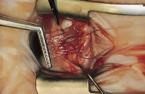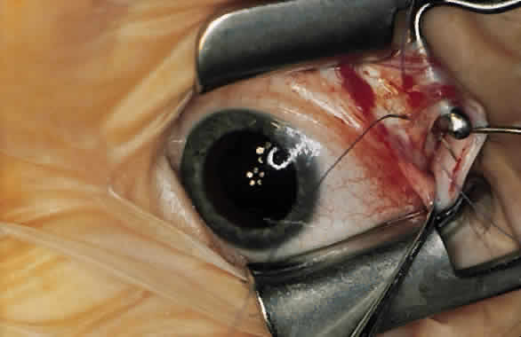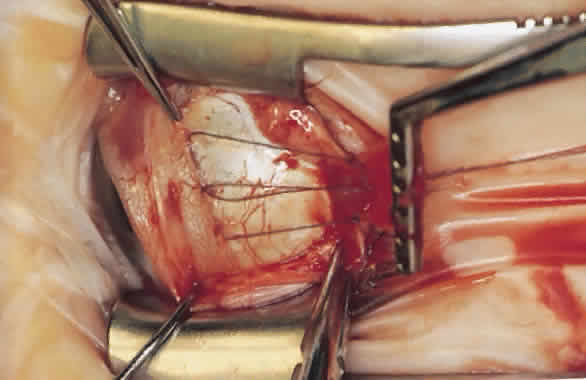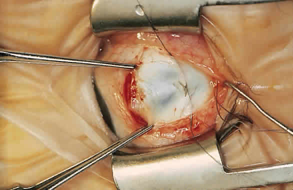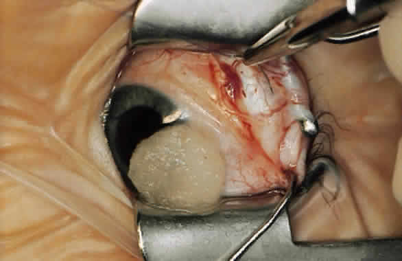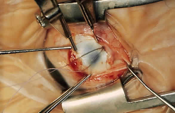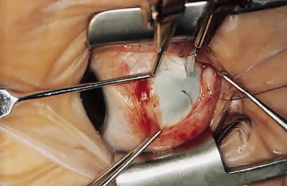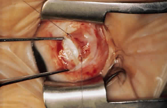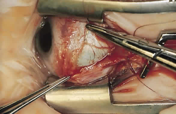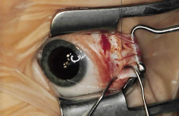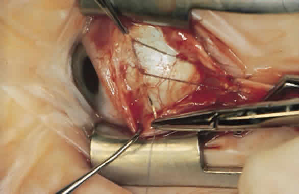 Other Considerations If hypertropia is present along with intermittent exotropia, the first consideration is whether the hypertropia is present at distance and near fixation and whether any dysfunction of the oblique muscles is present. If the deviation is present at both distance and near when the patient is dissociated into the exotropic phase, no oblique muscle dysfunction is seen, and the vertical deviation is a true vertical deviation as opposed to a dissociated vertical deviation, then surgical correction of the vertical deviation is indicated if the amount is 8 PD or more. A vertical deviation that is present only at distance and not at near is ignored in the surgical plan.34 In the rare instance when this far-near dissociated hypertropia is associated with a unilateral inferior oblique overaction, the inferior oblique muscle should be weakened along with the surgery on the horizontal muscles. If an A or V pattern is present in conjunction with the intermittent exotropia, the function of the oblique muscles must be evaluated. If the inferior oblique muscles are overacting in the presence of a V pattern and the superior oblique muscles are overacting in the presence of an A pattern, this dysfunction must be considered in the surgical plan. In V patterns, the overacting inferior oblique muscles should be recessed if the superior oblique muscles are normal or underacting. If the superior oblique muscles are also overacting, then careful consideration must be given to the effect of the oblique muscle dysfunction on the V pattern and the effect that recessing the overacting inferior obliques will have on the pattern. Pseudooveraction of the inferior oblique muscles should be suspected when tight lateral rectus muscles are associated with exotropia. In this situation, it is believed that the lateral rectus muscle of the exotropic eye becomes tight or contracted. When the eye is taken into adduction and slight upgaze, the tight lateral rectus muscle slides around the globe, causing the eye to elevate and to simulate overaction of the inferior oblique muscle. This concept was first suggested by Jampolsky. In A pattern deviations, if the inferior oblique muscles are normal or underacting, weakening the overacting superior oblique muscles can help collapse the pattern. However, if the inferior oblique muscles are overacting, care must be taken if a tenotomy of the overacting superior oblique muscles is performed because the A pattern may be converted to a V pattern. For both A and V patterns, when weakening the overacting oblique muscles is part of the surgical plan, surgery for the exodeviation should be done as measured in primary gaze position and without consideration for any oblique surgery that is done. Most strabismologists support this approach in patients who have a V pattern with overacting inferior oblique muscles. However, controversy exists when an A pattern is associated with overacting superior oblique muscles. Some authors report no change in the exodeviation in primary gaze position after surgical weakening of overacting superior oblique muscles is performed.35–38 Others report an inward shift of the eyes in primary gaze position after surgical weakening of overacting superior oblique muscles has been performed in patients with A pattern strabismus.39,40 In a series of eight patients with A pattern exotropia and overacting superior oblique muscles, Biglan noted a mean reduction of 8 PD (from 12 to 4) in the amount of exodeviation seen in primary gaze position after tenotomy of the superior oblique muscles.41 This difference in findings could be the result of different surgical techniques, such as performing the superior oblique tenotomy on the nasal versus the temporal side of the superior rectus muscle. When the oblique muscles are judged to be functioning normally in the presence of an A or V pattern, vertical displacement of the recessed or resected horizontal rectus muscles is required to treat the pattern. The recessed lateral muscles are moved down for an A pattern and up for a V pattern, and the resected medial muscles are moved in the opposite direction. When a muscle is infraplaced or supraplaced, the question arises as to how the recessed or resected insertion should be placed. The surgeon must determine whether the insertion should be moved and placed parallel to the original insertion, parallel to the limbus, or at a location between the two. Another suggestion is that the displaced pole (inferior pole in infraplacement and superior pole in supraplacement) should be recessed further or placed further posterior than the other pole to create a greater effect and limit any torsional effect. I prefer to make the new insertion parallel to the original insertion. Surgical Technique I favor a fornix incision more than a limbal incision unless extensive scarring from previous surgery makes the limbal approach a better option. A double-armed 6-0 Polyglactin 910 suture coated with polyglactin 370 (coated Vicryl) is used. This synthetic absorbable suture is 18 in long. For a recession, the suture is placed in the muscle 1 mm from the scleral insertion. One end of the suture is started near the middle of the muscle (tendon) 1 mm back from the sclera and is passed into the belly of the muscle, exiting at the lateral margin (Figs. 1 and 2). The needle is passed back through the muscle, perpendicular to the plane of the muscle and 1.5 to 2 mm in from the muscle edge to create a lock bite (Fig. 3). The suture is double locked. The other end of the suture is passed similarly, from the middle of the muscle through the muscle belly, out the other side. A lock bite is taken. This suture placement is a modified von Pirquet technique that was popularized by Parks.42