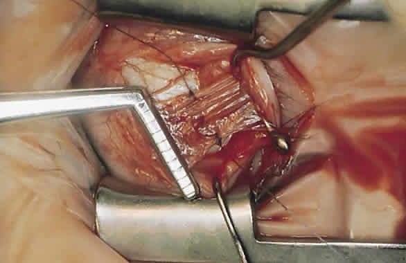 After the sutures have been placed, the muscle is disinserted from the globe with Westcott scissors. The cut is made as nearly flush to the globe as possible, and a minimal stump from the original insertion is visible under the replaced conjunctiva postoperatively. The advantage of this technique is that the suture that passes through the muscle between the lock bites at each edge maintains the normal width of the muscle when the muscle is removed from the insertion and resutured to the globe (Fig. 4). Placing the suture more than 1 mm from the insertion results in a resection as well as a recession and decreases the expected effect of the recession. The caliper is set at a predetermined amount to mark the site of the new insertion. The sclera is marked for needle placement directly posterior to one pole of the original insertion. The mark and the start of the subsequent needle pass must be made perpendicular to the end of the insertion to eliminate unintentional supraplacement or infraplacement. The second mark is made perpendicular to the other end of the original insertion (Fig. 5). The needles are passed so that their tips cross (Fig. 6). This placement allows the knot to be tied on a spot rather than around the curve of the globe. Tying a knot around the curve of the globe is similar to tying a string around a ball. After the muscle is pulled up and the knot is tied, each end as well as the middle of the muscle is measured with the caliper from the original insertion (Figs. 7 and 8). If the middle of the recessed muscle is sagging more than 0.5 mm, then one end of the suture is brought up through the middle of the muscle. The needle is passed just behind the area where the preplaced suture passes through the muscle. The middle of the muscle is then pulled up when the suture that is placed through the middle of the muscle is tied to the other end of the suture. It is important to measure from the same place on the muscle insertion, either the anterior, middle, or posterior part. I find it easiest to measure from the posterior edge because it is usually the most distinct landmark after muscle disinsertion. The accuracy of recessions should be within 0.5 mm. When a resection is performed, the medial rectus muscle is isolated. The muscle is cleaned of anterior Tenon's tissue and intermuscular septum back for 3 to 4 mm more than the amount of planned resection to allow for suture placement in the muscle. During a resection, a Jameson muscle clamp is placed around the muscle (tendon) as close to the insertion as possible (Fig. 9). With a caliper, the amount of muscle to be resected is measured back from the insertion on the belly of the muscle (Fig. 10). The double-armed 6-0 Polyglactin 910 suture is placed in the muscle at this point, following the procedure that is used for a recession. One end of the suture is locked at each margin of the muscle (Figs. 11, 12, and 13). The muscle is then disinserted. The preplaced sutures are positioned in the original scleral insertion. One is started at each end of the insertion, and both exit in the middle (Figs. 14 and 15). The sutures are passed up through the muscle belly, just behind the preplaced suture (Fig. 16). The Jameson clamp is used to position the muscle across the insertion at the level of the preplaced sutures, and the sutures are tied (Fig. 17). The muscle distal to the suture is then exercised (Fig. 18).