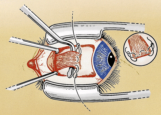 After the needles are removed, the suture ends are tied together loosely with a double throw. The eye is rotated away from the recessed muscle (i.e., laterally if the medial rectus muscle is adjusted) to allow the muscle to retract posteriorly beyond the intended position of recession. A mark is placed on the sclera with Castroviejo calipers preset to the desired amount of the recession from the original muscle insertion. The double throw is tightened until the muscle is pulled up to the scleral mark and the poles of the muscle are equal distance from the insertion. A loop or slip knot is placed over the double throw to secure the suture (Fig. 3). The conjunctiva is closed with 7-0 chromic suture. The conjunctival flap is pulled up until it partially covers the adjustable knot. The relaxing incisions may be closed with additional sutures if necessary (Fig. 4). The ends of the adjustable suture are taped to the skin of the lower lid or tucked into the lower cul-de-sac and held in place with an antibiotic-steroid ointment. An eye patch helps to keep the sutures in place during the immediate postoperative period.