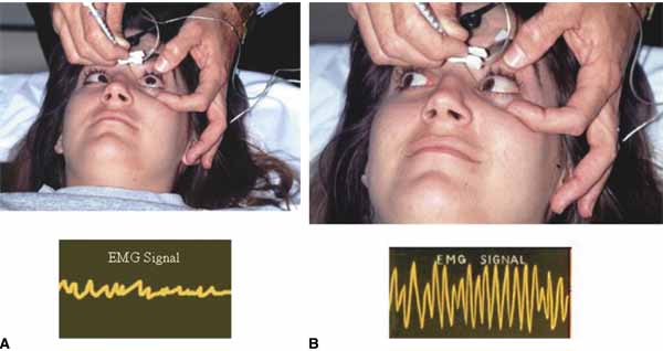 A pediatric electrocardiographic electrode is then attached to the patient's forehead, making sure that a good contact is present (see Fig. 3). It should be placed medially for the medial rectus and laterally for the lateral rectus. If not already done, the patient should be informed that an audio signal will be used during the procedure so that he or she will not become startled when the amplifier is turned on. Next, turn on the amplifier and test the connections by touching the needle tip to the conjunctiva. Any background noise should become extinguished and an audible click should be heard. If this does not happen, the ground connection to the needle hub should be checked and possible interference from overhead lights, etc., investigated. This is also the time to make sure that adequate topical anesthesia has been achieved. INJECTION TECHNIQUE Before beginning, it should be explained to the patient that he or she will have to move the eyes into various gaze positions during the procedure. Therefore, it is important that the patient keep both eyes open and fixed on some target. It is helpful to have an assistant during the injection procedure. Standing at the head of the patient, the lids are held open with the fingers. The patient should look away from the field of action of the injected muscle, for example, when injecting the medial rectus have the patient begin by looking laterally with that eye (Fig. 4). The assistant can use a hand or other fixation target for this purpose. The patient should be reminded to keep both eyes open so that fixation is maintained. With the bevel facing the muscle, the needle is inserted through the conjunctiva 8 to 10 mm from the limbus. Once through the conjunctiva, the needle is advanced several more millimeters until the tip is beyond the equator. The assistant should move the fixation target slowly to the primary position so that the injection-muscle EMG signal can be activated. If the medial rectus is being injected, continue to advance the needle straight posteriorly aiming for the optic canal (Fig. 5). When injecting the lateral rectus the syringe has to be angled toward the ear at approximately a 45-degree angle to avoid touching the periosteum of the lateral orbital wall with the needle point, which is quite uncomfortable (see Fig. 5). A slight angle is also necessary when injecting the superior rectus. The inferior rectus is often easier to inject through the lower lid rather than the conjunctiva. As the needle is advanced and while listening to the EMG signal, continue to advance until a loud crackling noise occurs. If uncertainty exists as to whether this is from the appropriate muscle, have the patient slowly look out of the field of action of the muscle to be injected. The signal should decrease. Care must be taken to ensure that slow eye movements are made. This may be somewhat difficult because the patient may be anxious or apprehensive and may experience some discomfort. When the electrode is at the appropriate location, the reconstituted toxin is injected slowly. The EMG signal should diminish at this point as the tissue is pushed away from the tip by the entering fluid. Allow the needle to remain in this position for 10 to 15 seconds and then slowly withdraw the needle. The patient should be checked for signs of hemorrhage or other potential complications. POSTINJECTION MANAGEMENT Once finished, the patient should be asked to sit up on the edge of the examination table but should not be allowed to stand until postinjection anxiety and bradycardia have subsided. Often the patient is so relieved that the process is over that an episode of lightheadedness or even syncope can occur. One to two minutes is usually all that is necessary at this time. It is not necessary to patch the eye or use antibiotics unless there is some concern about the injection process. The patient should be informed that topical anesthesia has been applied to the eye and ocular manipulation for the next 30 to 45 minutes should be discouraged. The patient should be observed for 5 to 10 minutes to make sure that no retrobulbar bleeding has occurred. Acetaminophen should suffice for any postinjection discomfort. | |||||||||||||||||||||||||