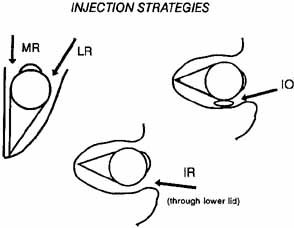 or teenager will be a good candidate. Until the ophthalmologist is familiar and experienced with the injection procedure, consideration should be given to treating only the horizontal rectus muscles. The vertical rectus muscles, because they have opposite functions from the nearby oblique muscles, require a higher level of expertise to avoid unwanted complications. Likewise, experience should be gained on adults before attempting injections in children. |