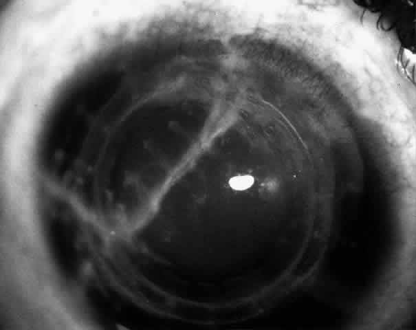 INTERFACE CYSTS Rests of epithelium have been noted in approximately 20% of patients undergoing epikeratophakia. Occasionally they enlarge and significantly impede vision. These cysts have been successfully curetted27 but occasionally result in the need to replace the lens.28 POWER INACCURACIES Historically, there had been a strong tendency toward undercorrection in children under 1 year of age. In children over 1 year of age, the change in refractive error was more predictable with the nationwide study demonstrating 73% within 3D of emmetropia. Low amounts of residual refractive error are often successfully corrected with spectacles. When the achieved power is inaccurate by an amount too large for spectacle correction, a lens exchange can be performed. In the case of lens exchange, the parameters for ordering the new lens should include the same diameter and the same original corneal curvature. The edge of the healed lens can be teased with a combination of traction and blunt dissection to loosen the peripheral attachment, and the new lens is sewed into place. Since the patient's Bowman's layer is intact, there should be no scarring across the central cornea. However, if the cornea had undergone trauma or had a corneal laceration, there may be scarring to the lens and a clean removal may be impossible. INFECTIONS Bacterial infections of the lenticule have constituted the most feared complication in this form of refractive surgery. Since devitalized acellular tissue is placed on a deepithelialized cornea, an infection is potentially quite damaging. In the past, bacterial infections have been found to consist of organisms that are normal nasopharyngeal flora in children, that is, Hemophilus and pneumococcus. Parents should be alerted to respond immediately to complaints of pain or signs of discharge with a visit to the physician so that an early diagnosis can be made. Infections are treated by removal of the lens and the sutures and the application of topical antibiotics. If a lens has been in place for several months, the tissue can be treated much like normal cornea; an infected peripheral corneal ulcer caused by trauma, for example, may be treated with antibiotics without removal of the lens. Because of the potential for bacterial infections, I do not routinely use topical corticosteroids in children with epithelial defects. Instead, the children are given oral antibiotics such as amoxicillin or an amoxicillin/clavulanate potassium combination (Augmentin) and the parents are instructed to instill ointments onto the lashes through the holes in a plastic eye shield (see Fig. 13). This prevents the parents from manipulating the eye and lessens the chance of the child's inoculating an organism. LENS DEHISCENCE A portion of the wing of the lens may become elevated out of the stromal bed before the sutures are removed. If this occurs, and the lens edge is not repositioned, the result may be permanent astigmatism and degradation of visual acuity. The lens edge may be repositioned at the slit lamp or with the patient under anesthesia; an additional suture should be added in the area to prevent recurrence. Occasionally, removing a suture at examination under anesthesia may cause the edge of the graft to dehisce, allowing an air bubble to form between the cornea and the lens. Small sections of dehiscence may not require treatment, but several clock hours of separation probably should be dealt with by replacing sutures and removing them later at a separate sitting. |