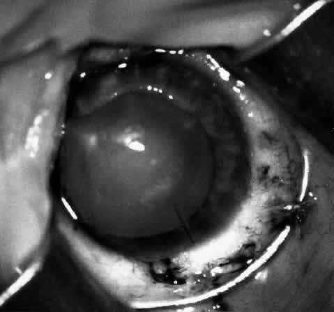 Children are usually discharged from the hospital the afternoon of surgery. They are given oral antibiotics (amoxicillin 20 mg/kg/day in three divided doses) and topical atropine and gentamicin ointment are squeezed onto the eye through the holes in the plastic shield. Parents are instructed not to allow the child to rub the eye or to remove the shield. Parents may remove the shield for cleaning and the physician removes the shield in the office for examination during postoperative visits. POSTOPERATIVE CARE The eye is usually examined on the first and second day after surgery and then daily until the epithelial cover is complete. Fluorescein may be instilled in the eye to delineate the extent of the epithelial cover. If the epithelial defect is closing quickly, a pressure patch may be left in place for up to 48 hours. Two weeks after surgery the child is again put under general anesthesia, the eye is stained with fluorescein to determine if the epithelial cover is complete, and the sutures are removed. At the end of the procedure the eye is pressure-patched for 24 to 48 hours. The application of topical atropine and gentamicin ointment and the use of the plastic shield are continued, but systemic antibiotics are generally stopped at this time. Amblyopia therapy is instituted within 1 to 2 weeks of suture removal. The epithelium is generally somewhat hazy; however, once a retinoscopic reflex can be achieved it is then appropriate to institute amblyopia therapy. The parents are instructed to begin patching the sound eye 3 hours the first day (“warm-up” patching), 4 hours the second day, and so on, increasing the patched time progressively to 8 to 10 hours a day. This level of patching is generally maintained until a plateau in visual acuity is reached-usually 4 to 6 months after surgery. If a significant spectacle overcorrection is needed, the over-refraction is generally given in spectacles with a bifocal 4 to 6 months after surgery when visual acuity has stabilized. |