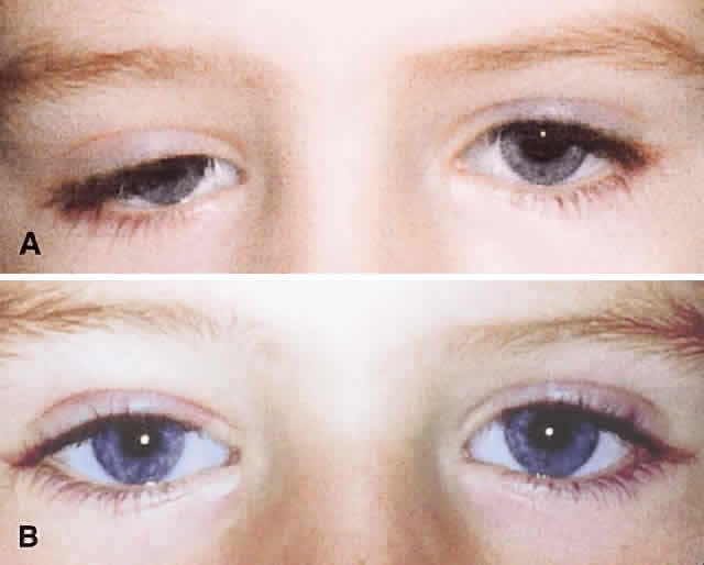 blepharoptosis is never nuclear or supranuclear in origin. The origin of the levator muscle is just above that of the superior rectus muscle at the orbital apex. The levator muscle becomes a flattened, thinned layer of noncontractile tissue as it approaches its insertion into the tarsal plate and into the skin of the upper lid. This nonmuscular portion of the levator is termed the levator aponeurosis. Transition from muscle to aponeurosis is abrupt and can be visually identified easily as the tissues are exposed surgically. The levator muscle is a relatively weak muscle the sole function of which is elevation of the eyelid. An observer easily perceives any asymmetry in lid elevation, contour, or width of the palpebral fissures. Blepharoptosis may result from localized primary or secondary dystrophy of the levator muscle, neurologic dysfunction, myoneural junction dysfunction, or, for complex and poorly understood reasons, as a developmental defect associated with other craniofacial and genetic syndromes. Clinical experience with childhood ptosis suggests that most levator muscles of ptosis patients are dystrophic. Levator muscle and aponeurosis tissues appear to be infiltrated or replaced by fat and fibrous tissue. However, levator muscle fiber size and distribution are not abnormal in other patients and blepharoptosis is not related to other forms of muscular dystrophy.1 Astigmatism and amblyopia occur as a result of blepharoptosis.2–5 Surgical repair of blepharoptosis does not mitigate the need to treat amblyopia. Indeed, amblyopia treatment in young patients may become more necessary after surgical treatment of ptosis.2 Any noted increased astigmatism after surgical repair of ptosis may be transient in other patients.6 Severe ptosis has been shown to produce axial myopia in experimental animals.7 Transient ptosis early in the neonatal period may not produce amblyopia.8 Blepharoptosis has other physical, functional, and psychological consequences. Repair of blepharoptosis in childhood usually has functional implications. Many methods of blepharoptosis repair have been described in detail.1 Procedure choice depends on treatment goals, the underlying diagnosis, degree of levator function, and the skill and experience of the surgeon. Surgical treatment results can be pleasing to the patient and to the family (Fig. 1).