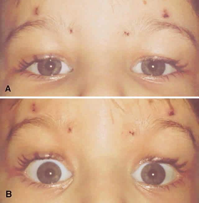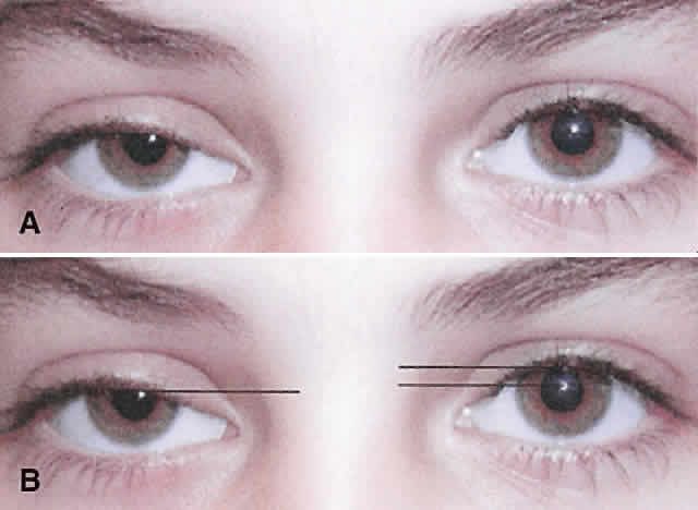 a progressive mitochondrial disorder. Visual acuity and refractive error should be recorded. A thorough eye examination, particularly for strabismus, corneal sensitivity, and retinal dysfunction, should be done. Tear function should be measured if any doubt as to the adequacy of tear production exists. Occasionally, the examiner must determine whether apparent ptosis is in fact pseudoptosis or whether lid retraction of the contralateral upper lid exists. To detect pseudoptosis, lid height should be observed and measured with each eye fixing on a distant target. Lid position in downgaze should be noted. If ptosis is congenital, the ptotic lid appears short (higher) in downgaze. A ptotic lid does not appear short in downgaze when ptosis is acquired. If lid retraction is present, the higher lid remains high in downgaze (Fig. 2). An exophthalmometer is frequently used to assess relative proptosis or enophthalmos of each eye. The patient should be asked to close eyes forcefully as the examiner holds the upper and lower lids apart. If the globe elevates during forced lid closure, a normal Bell phenomenon is present. External photographs of the eyes and face should be included in the patient's records.