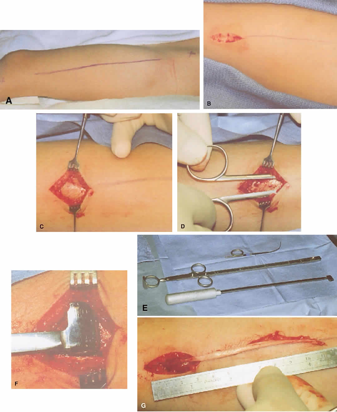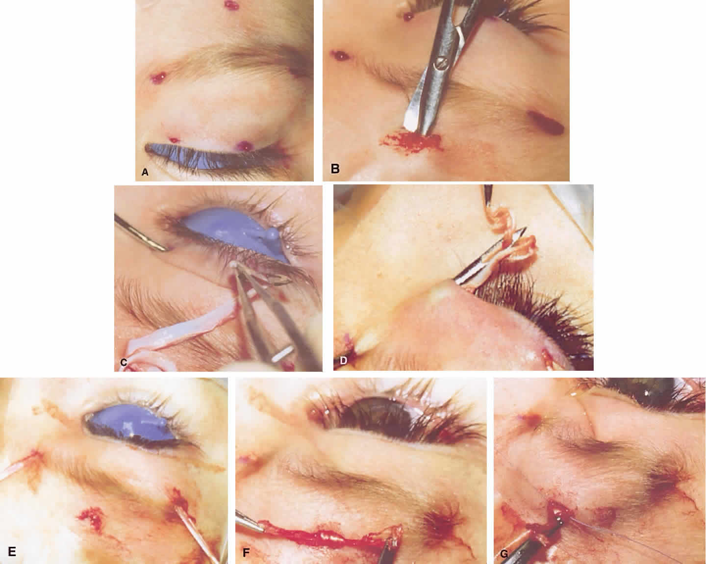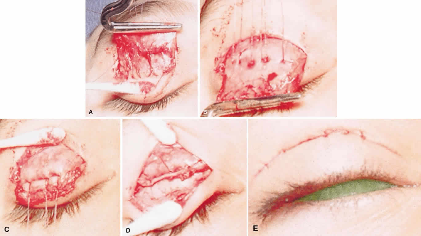attachment of the upper lid to frontalis muscles with nonabsorbable material. INDICATIONS The procedure is indicated when levator function is less than 4 mm such as is found in patients with severe congenital ptosis, blepharophimosis syndrome, partial CN-3 palsy, or agenesis of the nerve supply to the levator muscle. Frequently, levator function is poor in one eye, but good or normal in the fellow eye. Frontalis suspension procedures produce lagophthalmos that is particularly noticeable in downgaze. Lagophthalmos effect is more apparent if a unilateral suspension procedure is done. Most surgeons prefer to perform a bilateral suspension procedure for unilateral severe ptosis. Disinsertion of the normal levator has been advocated when severe unilateral ptosis is present but is seldom done in practice. Unilateral procedures are performed when the family will not permit a bilateral procedure to be done in such circumstances. CONTRAINDICATIONS This procedure is relatively contraindicated in patients with limited elevation of the eye, as is seen with complete CN-3 palsy, double elevator palsy, and inferior restriction syndromes. Anesthetic corneas are also a relative contraindication. Mild to moderate degrees of ptosis are better treated with alternative procedures. An advantage of the frontalis suspension procedure is that it can be “undone” relatively easily if corneal exposure becomes a problem. In patients with the above conditions, frontalis suspension procedure may be done more safely if final lid height is positioned lower than ideal to minimize the potential corneal risks. SURGICAL TECHNIQUE Several materials are available for securing the lids to the frontalis muscles. Consensus suggests that the best material in terms of strength, longevity, and absence of complications is autogenous fascia lata. Fascia lata can be obtained from the leg of a child who is 3 years old or older. For younger patients, alternative materials are often necessary. Alternatives to autogenous fascia lata include preserved (tissue bank) fascia, nonabsorbable suture material (such as 2-0 Prolene), silicone bands, suture-reinforced sclera, and Gore-tex. Other autogenous materials used less frequently include palmaris longus tendon and temporalis fascia.16 Autogenous fascia is obtained from the lateral thigh after identifying the anterior superior iliac spine and the head of the fibula. Just posterior to a line connecting these two points is the area of the thigh where fascia lata is best obtained (Fig. 7A). An incision is made far enough above the knee to avoid the joint capsule. The incision must be 3.5 to 4 cm long (see Fig. 7B). Dissection proceeds through skin and subcutaneous fat to the glistening surface of the fascia. In an older child, the vertical direction of the fascia fibers is easily discerned (see Fig. 7C). In a younger child, the fiber orientation is less well defined. Along the line described above, the fibers of fascia are incised with two parallel incisions made about 1 to 1.5 cm apart. The underlying muscle bulges outward. With long-handled, blunt-tipped scissors, fascia is separated from overlying fat and underlying muscle (see Fig. 7D). A Crawford's fascia stripper is used to obtain a strip of fascia that is 12 to 15 cm long (see Fig. 7E-G). Bleeding is minimal and may be controlled with compression. No attempt is made to close the fascia wound in the leg. Skin and subcutaneous tissues are closed with interrupted absorbable sutures. A nonencircling pressure dressing is applied. The excised fascia strip is placed on a sterile surface, such as a tongue depressor, separated from any attached fat or muscle, and split into two strips with a single incision made with a scalpel. The fascia strips are kept moist with saline and are covered until they are required for placement. A surgical marking pencil is used to outline proposed skin incision sites on the lids and brow. Several geometric configurations have been described for the placement of the suspension material. In smaller children with limited space, fewer incisions and simpler configurations are desirable. A horizontal lid mark is made 1.5 mm above the lid margin and in line with the nasal limbus of the cornea. A second mark is made at the temporal lid margin in line with the temporal limbus. When viewed together, these marks appear to be skewed slightly toward the nasal side of the lid. A third mark is made just above the brow and centered between the marks on the lid margins. A fourth and then a fifth mark are made in the brow nasal and temporal to the lid marks, forming a pentagonal configuration as the marks are viewed together. Similar marks are made on the opposite lid and brow. The marks are inspected for symmetry and are repositioned as required. Corneal protectors are placed in both eyes, and the skin is incised where marked (Fig. 8A). Incisions are short, almost like puncture wounds, and are made only through the skin. The central incision is made slightly larger and is undermined superiorly (see Fig. 8B). A Wright's needle or its equivalent is used to thread the suspension material through the wounds, beginning at the lid incisions and eventually exiting with both ends of the suspension material through the central incision (Fig. 8C and D). After the suspension material has been placed in the lid and brow incisions but before placement into the central incision, the surgeon can elevate the lid and check for contour and height (see Fig. 8E). Depending on the material used, the suspension material is tied either to itself and sutured or simply sutured one arm to the other. If autogenous fascia is used, a single-throw knot is tied in the fascia (see Fig. 8F). This knot is secured with an absorbable synthetic suture (see Fig. 8G). If heterogeneous fascia is used, no knot is tied in the fascia, but the ends of the fascia strip are sutured to each other with nonabsorbable sutures. The knot of material and sutures is positioned deep 