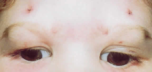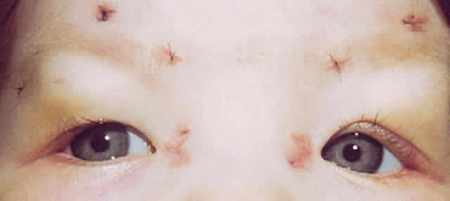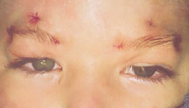 Lid-brow incisions should be marked and placed symmetrically. Postoperative lid position may be too high or too low. Overcorrection rarely is a problem in children if ocular rotations are normal. When CN-3 palsy or other conditions limit elevation of the eye, a suspension procedure may have to be adjusted downward or removed altogether if corneal problems develop. Suspension materials may dissolve or break. Suture material that is too small may tear through through soft tissue, like a wire cutter through soft cheese, thus reducing the effectiveness of the procedure. The most enduring and least complicated suspension materials are autogenous fascia or (presumably) autogenous tendon. However, patients who have had fascia lata harvested may complain of leg pain or appearance of the scar.18 F.D.E. has observed a small herniation of muscle through the fascia lata harvest site. |