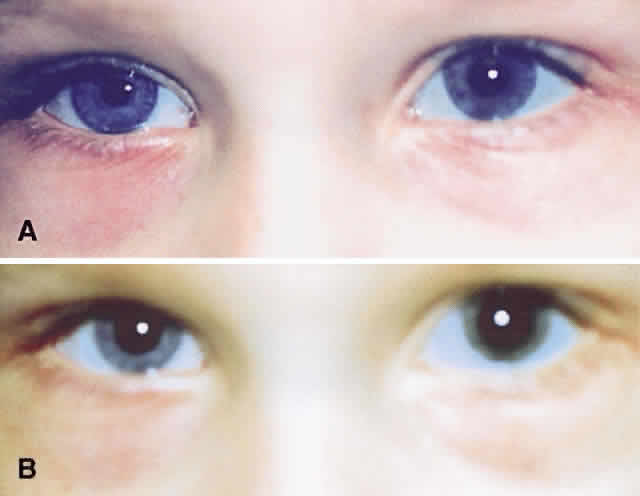 KEARNS-SAYRE SYNDROME AND CHRONIC PROGRESSIVE EXTERNAL OPHTHALMOPLEGIA Kearns-Sayre syndrome is a mitochondrial deletion disorder characterized by progressive external ophthalmoplegia, heart block, retinitis pigmentosa and, occasionally, with endocrine and central nervous system manifestations.44–46 These disorders begin in childhood and patients often present to the ophthalmologist with complaints of blepharoptosis. The conditions are most likely to become symptomatic in the first or second decade. Bilateral ptosis is a prominent feature of the syndromes, and levator function is poor. Systemic associated problems are of primary importance. Frontalis suspension procedures are required for correction of ptosis but limited ocular rotations make corneal exposure risks significant. However, ptosis surgery has functional implications in most cases. Upper lid blepharoplasty has been recommended as a safer alternative to suspension when corneal exposure is expected to be a postoperative problem.47 Chronic progressive external ophthalmoplegia may be considered a limited form of Kearns-Sayre syndrome that shares the ocular manifestations but has fewer systemic manifestations. However, this distinction is not helpful in the individual case because affected patients also may have night blindness, cardiac conduction defects, and other systemic symptoms. Progressive external ophthalmoplegia usually begins in the second or third decade and ptosis is a common presenting sign. Ophthalmoplegia develops fairly early and may be accompanied by diplopia in the occasional case in which extraocular involvement is asymmetric. Many systemic associations have been described. Extraocular muscle surgery can be helpful in certain patients.48 Myotonic Dystrophy Myotonic dystrophy shares many of the manifestations of Kearns-Sayre and chronic progressive external ophthalmoplegia syndromes, but, in addition, patients have polychromatic cataracts, gonadal atrophy, premature thinning or loss of the hair, and other systemic problems. Delayed (myotonic) relaxation of skeletal muscles may prolong a hand-shake. The disorder is believed to be the most common inherited neuromuscular disease in adults. It is an autosomal dominant disorder that is characterized clinically by myotonia and progressive muscular weakness. Myotonic dystrophy may occur congenitally. The disorder has been localized to chromosome 19. Ptosis is a prominent early feature. Myasthenia gravis has been reported to be associated but is considered to be a separate and distinct entity.49,50 Blepharochalasis Infiltrative processes that thicken the lids and produce blepharoptosis characterize blepharochalasis. Angioedema frequently involves the upper lids through recurrent episodes of eyelid edema. Edema can be of startling proportions. The condition may be unilateral or bilateral, active or quiescent, with hypertrophic and atrophic forms. Thinning of the levator aponeurosis occurs with repeated attacks until ptosis results. The lacrimal glands may prolapse. Orbital fat also is affected and progressively atrophies. As a result of fat atrophy and ptosis, patients have an emaciated appearance about the eyes. C1 esterase inhibitor levels may be deficient, particularly if the condition is familial.51 Because of poor levator function in severe cases, the surgeon may perform a frontalis suspension but the suspension material will be visible beneath the very thin eyelid skin. A surgical procedure on the eyelids may be more hazardous because of the extreme thinning of the lids. The best procedure is an aponeurosis repair in which nonabsorbable sutures are used to reattach aponeurosis to tarsus. Aponeurosis dehiscence may not be as readily visible to the surgeon as in the adult with acquired ptosis. The aponeurosis usually can be found detached from the tarsus and elevated behind the orbital septum which must be unrolled to expose the aponeurosis. Redundant eyelid skin will be evident after the levator is reattached and the lid is repositioned. Excess skin should be excised. Other causes of blepharochalasis should be treated by treating the underlying disease process or by blepharoplasty procedures. Myasthenia Gravis A defect at the myoneural junction that produces relative unresponsiveness to released acetylcholine characterizes myasthenia gravis. This condition may be transient, congenital, and familial. Presenting symptoms are frequently ocular and ptosis is a prominent feature of the disorder. Several simple office tests have been useful in the office diagnosis of myasthenia.52–58 The office diagnosis of myasthenia gravis usually is verified with a Tensilon (ICN Pharmaceuticals, Costa Mesa, CA) test, although false-positive, false-negative, and paradoxical responses occur. Preinjection and postinjection measurements of lid position are made. Elevation of the lids in response to the injection indicates the likelihood of myasthenia gravis. Diagnosis also may be made with sophisticated eye movement recording devices or with single fiber electromyography. Additional confirmation of the diagnosis by measurement of serum acetylcholine receptor antibodies can be done but, in our office, this test has been positive in fewer than 50% of our patients with proven ocular myasthenia. Response to treatment is useful diagnostically. Myasthenia gravis with significant eyelid and eye muscle involvement seldom responds to Mestinon (Roche, Nutley, NJ) alone; often, corticosteroids are required for control of the myasthenia. Even then, restoration of lid position to acceptable levels is not always achieved. Surgical procedures can be helpful in the management of myasthenic blepharoptosis. However, benefits may be temporary, and operative procedures may have to be repeated. Depending on levator function, an external levator resection or a frontalis suspension procedure may be required although the general rule is to be conservative both in the recommendation for and in the performance o