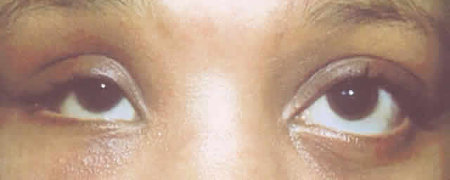 CONGENITAL The classic ptosis synkinesis syndrome is that of Marcus Gunn jaw-winking phenomenon. In this condition, the motor nerve to the external pterygoid muscle is misdirected to the ipsilateral levator muscle. Lid elevation occurs with mastication or with movement of the jaw to the opposite side (contraction of the ipsilateral external pterygoid muscle; Fig. 16). The condition may occur as an isolated finding or in association with other conditions, such as fibrosis of the extraocular muscles.41 Treatment is directed toward elimination of lid elevation with mastication, yet providing adequate lid height. The abnormally innervated levator muscle must be detached from the lid to reduce winking. A frontalis suspension procedure then becomes necessary. In cases in which winking is minimal, an external levator resection can be performed, although winking persists in many cases.42,43 Any residual wink may be accentuated by the higher lid position. CN-3 palsy may be associated with aberrant regeneration, producing ipsilateral lid elevation on attempted adduction or infraduction of the globe. Constriction of the pupil may occur under the same circumstances. Treatment must be directed toward positioning the lid in the primary position after the globe is repositioned. Duane's syndrome is produced when the CN-6 fails to adequately innervate a lateral rectus muscle that then acquires a twig of the motor nerve to the medial rectus muscle. Although the synkinesis produced does not involve lid innervation, enophthalmos with apparent ptosis may be produced and may be evident with the eyes in primary position. The upper lid descends further and the lower lid apparently elevates when the eye is adducted because of cocontraction of the horizontal rectus muscles. Treatment is directed toward achieving proper globe position before the problem with lid position is addressed. Levator function usually is excellent in these patients and lid surgery rarely is indicated. ACQUIRED BLEPHAROPTOSIS Crushing injuries around the skull and face that result in CN palsies may result in abnormal neurologic connections if reinnervation occurs. Aberrant regeneration of the CN-3 also may occur as a result of brain tumors, aneurysms, and neurosurgical procedures. Vascular complications from diabetes mellitus never produce aberrant innervation. |