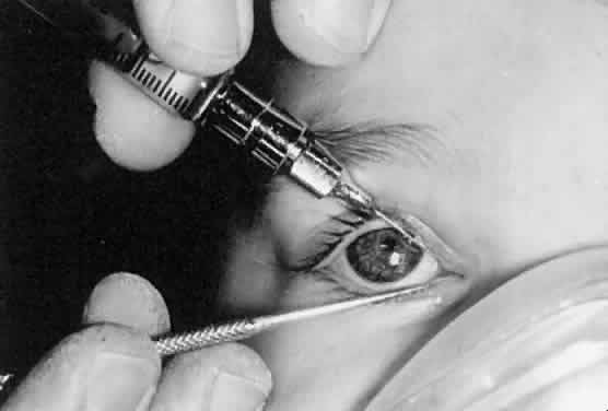 Recently, a nasolacrimal duct probe with a balloon catheter has become available as an adjunct to standard probing.15 Several reports of its use have been published,16,17 but it is not clear whether or in which cases this new instrumentation will be advantageous. EXPECTED RESULTS After a successful probing, tearing and discharge usually clear within 1 to 2 days. A topical antibiotic ointment or solution can be used if there is much mucopurulent discharge at the time of probing, but these are discontinued as soon as the eye appears to be clear. The normal passage of tears through the lacrimal drainage system helps to clear residual discharge. Initial probings are successful in over 90% of patients.13,12 Some surgeons have found a decrease in the success rate if the probing is delayed beyond the second or third year,18 but many patients can be cured by probing up to 5 years of age or older.2,3,19 If tearing and discharge persist after apparently successful probing, a second probing can be done in a month with the option of placing silicone tubing in the lacrimal system at that time. If it has not been possible to pass the probe into the nose because of bony obstruction at the lower end of the lacrimal duct, dacryocystorhinostomy is required to establish satisfactory tear drainage. Occasionally, the probe seems to pass into the nose, but irrigation is not free. In this case, it is unlikely that the probing will be successful. Repeat probing at the time, or reprobing with the option of silicone intubation after a 1-month interval, may resolve the issue. COMPLICATIONS Most probings are free of complications. A false passage of the probe may be signaled by extravasation of saline into surrounding tissues at the time of irrigation. This usually subsides in a short time, but prophylactic systemic antibiotics are advisable. Postoperative fever occasionally occurs after an otherwise unremarkable probe and probably is secondary to bacteremia induced by the probing.20 The fever subsides with antipyretics, and antibiotics are not routinely required. |