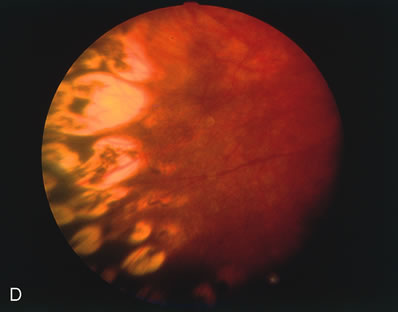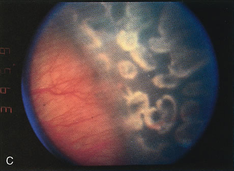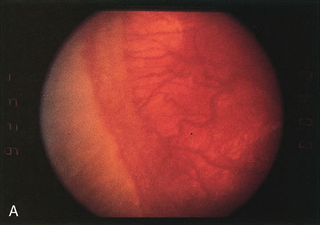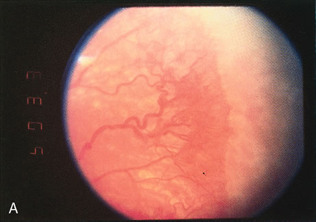Most often, treatment can be accomplished without making conjunctival incisions. When threshold disease is present in zone I or posterior zone II, it may not be possible to treat the entire avascular zone without a conjunctival incision. A small incision 4 to 6 mm posterior to the limbus within the center of the quadrant is adequate to allow the cryoprobe tip to fit. Depending on the extent of disease, one to four incisions may be made. These incisions need not be sutured if they are less than 3 to 4 mm long. Occasionally, corneal clouding occurs during treatment, obscuring the view. Removing the lid speculum and waiting several minutes often results in clearing. If waiting fails, the epithelium may be removed with a cotton-tipped swab soaked in cocaine hydrochloride 4% solution. Use of the swab provides excellent topical anesthesia as well. If removing the corneal epithelium with cocaine does not result in clearing of the cornea, the procedure can be completed later. Vitreous hemorrhage also may occur during treatment, necessitating termination of the procedure. The hemorrhage usually results from bleeding from a florid area of extraretinal fibrovascular proliferation caused by pressure on the globe from the cryoprobe. Treatment should be completed when the vitreous hemorrhage is clear enough to permit further photocoagulation. EXPECTED RESULTS The desired outcome after cryotherapy is regression of both plus disease and extraretinal fibrovascular proliferation (Fig. 4). Without regression, features of unfavorable outcome, both anatomic and functional, may develop. The structural and functional benefits of cryotherapy in eyes with threshold disease have been demonstrated by the CryoROP study at 1 year, 3 ½, and 5 ½ years post enrollment.11,19 At 10 years post enrollment structural outcome was unfavorable in 47.9% of control eyes versus 27.2% of treated eyes. Unfavorable functional outcome (Snellen visual acuity of 20/200 or worse) was identified in 62.1% of control eyes versus 44.4% of treated eyes at 10 years. The percentage of eyes with 20/40 or better visual acuity was similar for both treated (25.2%) and untreated (23.7%) eyes at 10 years with no statistical difference between the two groups.10
