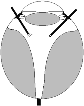 INDICATIONS Vitreous surgery may be performed for stage 4 and 5 ROP. Controversy remains as to whether or not vitrectomy surgery should be offered for stage 4A disease. This is in large part because of two different findings from the CryoROP study. First, visual acuity was worse than 20/200 in 82% of eyes at 4½ years with stage 4A retinal detachments at the 3 months examination.61 Second, the CryoROP study71 demonstrated a uniformly poor anatomic and visual outcome following vitrectomy for stage 4 and 5 ROP. Fortunately, improvements in closed vitrectomy surgical techniques over the past two decades now offer hope for many eyes with advanced disease.72 The surgery is complicated and the visual results may be poor, so patients should be selected carefully. CONTRAINDICATIONS A fellow eye with minimal or regressed ROP is a relative contraindication to vitreous surgery for advanced disease. Corneal opacification may also preclude surgical repair, although an open-sky vitrectomy with corneal transplantation can be performed if ultrasound demonstrates an open funnel retinal configuration.73,74 Eyes with obvious buphthalmos and glaucoma have a poor visual result, and should not have surgery. High intraocular pressure at the time of immediate preoperative evaluation is a relative contraindication to surgery. Permanent optic nerve and retinal damage may have occurred, and will result in a poor visual prognosis, even if the retina is reattached. No light perception vision (no response to a bright light) is a relative contraindication to surgery. Bound-down iris prevents the pupil from reacting to light, and a completely detached retina with epiretinal membrane formation may prevent the child from wincing when exposed to a bright light. Testing by visual evoked potential may objectively confirm a clinical suspicion of no light perception.75 As with other forms of surgery, the infant's systemic condition should be considered. As with scleral buckling, vitreous surgery is performed under general anesthesia, and any contraindications to this form of anesthesia will necessitate delaying the surgery. PROCEDURE Vitreous surgery for advanced ROP continues to evolve with improvements in surgical technique and equipment. The advent of wide-field viewing systems, the infusion light pipe, and improved surgical instrumentation have facilitated surgical repair. The timing of surgery for advanced ROP is important. If plus disease with engorgement of the iris vasculature and tortuosity and dilation of the retinal vessels are present, vitreous surgery should be postponed until ablative therapy has been performed to the avascular retina. Ablation of avascular retina does not reduce traction from the vitreous, but it does induce regression of plus disease thereby reducing the risk of intraoperative hemorrhage. If there is persistent, severe plus disease, Trese76 recommends a two-step approach. Patients initially are treated with ablative therapy to the peripheral attached avascular retina. Within 3 weeks, in most cases, the plus disease has regressed to a point that vitreous surgery may proceed. There are two approaches to vitreous surgery in infants with advanced ROP; open-sky vitrectomy and closed vitrectomy. Both have advantages and disadvantages. In the past, the main advantage to open-sky vitrectomy (vitreous surgery through a trephined opening in the cornea) was easy access and visualization of the anterior retina and epiretinal membranes. Today, improved closed vitrectomy surgical techniques have negated these advantages. The disadvantages of open-sky vitrectomy include lack of intraocular pressure control and difficulty in posterior manipulation. Closed vitrectomy has the advantages of maintenance of intraocular pressure, minimal distortion of tissue, and good visualization in the posterior pole. There are very few if any disadvantages of closed vitrectomy now that bimanual manipulation is a reality. The goal of vitreous surgery for severe stage 4 and 5 ROP is mechanical release of vitreoretinal traction, which can be accomplished with either form of surgery. Before undergoing vitrectomy, the patient should be examined under anesthesia. This assessment should include biomicroscopy, measurement of corneal diameter, tonometry, indirect ophthalmoscopy, fundus photography, A-scan and B-scan ultrasonography, visual evoked potential if necessary, and examination under the operating microscope. The technique of open-sky vitrectomy was pioneered by Schepens77 and Hirose and others,78and was modified by Hirose and associates73 and Tasman and colleagues (Fig. 10).74 Improvements in closed vitrectomy techniques have now almost eliminated the need for open-sky vitrectomies in the treatment of advanced ROP. If corneal opacification is present, corneal button removal followed by placement of a temporary keratoprothesis can be used to provide a closed working environment. This combined procedure allows excellent visualization of the anterior retina during bimanual surgery while providing a controlled intraocular pressure.