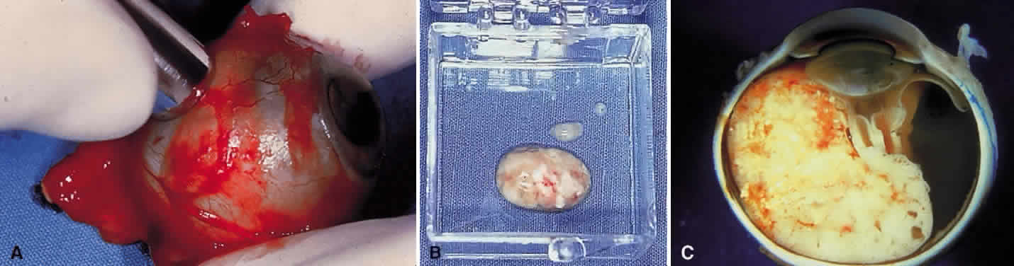 with orbital involvement. INDICATIONS Exenteration for retinoblastoma is indicated if there is macroscopic orbital invasion or orbital recurrence of retinoblastoma that is progressing despite irradiation and chemotherapy. Microscopic invasion of the orbit, found on histopathologic evaluation of the globe, should be treated by orbital radiotherapy and systemic chemotherapy. In addition, choroidal and optic nerve invasion of retinoblastoma generally is treated with systemic chemotherapy, and in certain instances, external beam radiotherapy.53–55 Exenteration is reserved for advanced tumor in the orbit, which is resistant to conservative treatment. TECHNIQUE The techniques of orbital exenteration are discussed in recent textbooks and are briefly considered here.51,52,56 The technique of orbital exenteration varies, but it usually involves the removal of all of the orbital content within the periosteum. If the eyelids are not involved by tumor, then they can be preserved with the “eyelid-sparing” technique. Under general anesthesia, a skin incision is made 2 mm above the upper eyelid margin and 2 mm below the lower eyelid margin to connect at the medial and lateral canthus. A skin-muscle flap is created within the eyelids up to the orbital rim. The periosteum is incised 2 mm outside of the orbital rim. The periosteum is elevated off of the orbital bone for 360° at the rim and back to the orbital apex. A clamp is placed at the eyelid margin for retraction, and the contents of the orbit are lifted out of the bony socket after the apex is cut. Thrombin-soaked gauze is used to temporarily pack the orbital socket. After orbital hemostasis, the eyelids are sewn together, and this skin-muscle complex retracts and lines the orbital bones, providing a concave, cutaneous bed for the prosthesis. COMPLICATIONS Complications of exenteration include orbital hematoma, serous fluid collection, infection from the adjacent sinus, dural wound leak at the apex, and wound dehiscence. These usually occur within the first 48 hours after surgery, therefore early follow-up is important. RESULTS Most patients who have the eyelid-sparing exenteration heal within the first 2 weeks from surgery and are fitted with an orbital prosthesis about 1 month from the time of surgery. The healing from the eyelid-sparing technique is much faster and more complete than the eyelid removal technique, which generally takes up to 2 or more years to granulate adequately.51 |