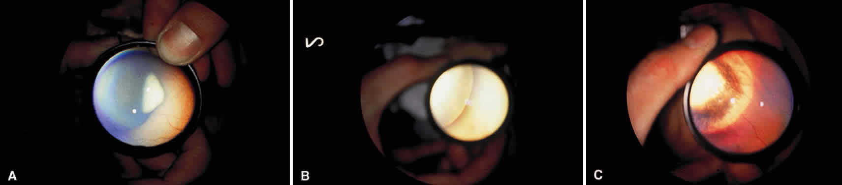 cells into the vitreous. INDICATIONS Cryotherapy may be used as the primary treatment for small peripheral retinoblastomas that are located between the equator and ora serrata. It also is used to treat residual or recurrent tumors in the peripheral fundus after incomplete eradication with external beam irradiation. Such recurrences usually occur near the ora serrata and probably occur secondary to incomplete irradiation of the most anterior portions of the retina. We believe that cryotherapy is not appropriate if there is seeding of tumor cells into the overlying vitreous cavity. With the advent of chemoreduction (discussed later), cryotherapy is used on normal peripheral retinal tissue to induce exudation of intravenous chemotherapy into the eye. TECHNIQUE Cryotherapy for retinoblastoma should be administered by the triple freeze-thaw technique. Using careful indirect ophthalmoscopy, with the cryoprobe used as a scleral depressor, the tumor is elevated on the tip, and freezing is applied until the surrounding retina turns white and ice crystals appear in the overlying vitreous (Fig. 5). After adequate freezing of the entire mass, the tumor is allowed to thaw. Then, it is refrozen immediately, and the sequence is repeated. Three successive freeze-thaw applications usually are adequate. It may be necessary to repeat the treatment in 3 to 4 weeks if there is still ophthalmoscopic evidence of viable tumor. COMPLICATIONS There are few major complications of cryotherapy for retinoblastoma. All patients develop transient conjunctival chemosis and often mild eyelid edema. These findings resolve over a few days. Local vitreous hemorrhage or transient localized retinal detachment (ablatio fugax) may occur at the time of treatment, but this usually resolves within a few weeks to months. Pigment migration and proliferation secondary to cryotherapy usually do not cause visual problems. In rare cases, cryotherapy may stimulate vitreoretinal traction, leading to a direct or contracoup retinal tear.32 Excessive cryotherapy to the ciliary body region, however, could lead to possible ciliary body shutdown, ocular hypotension, or rarely, to phthisis bulbi. RESULTS We have reported our results of treatment of 67 retinoblastomas in 47 eyes of 45 patients that were treated with triple freeze-thaw cryotherapy.30 Tumor destruction was achieved with one or more cryotherapy applications in all cases in which the tumor was no greater than 2.5 mm in diameter and 1.0 mm in thickness, and in which the tumor was confined to the sensory retina without seeding into the adjacent vitreous. Cryotherapy appears to be generally successful for tumors up to 3.5 mm in diameter and 2.0 mm in thickness, but more than one treatment may be necessary. |