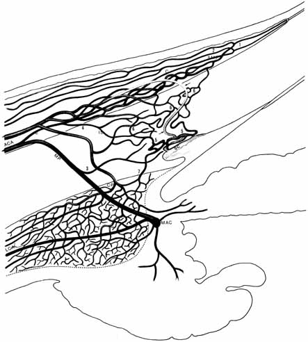 The scleral thickness varies considerably in the anteroposterior dimension. It is thickest near the optic nerve, measuring 1 to 1.35 mm, and gradually thins anteriorly, where it measures 0.4 to 0.6 mm in thickness at the equator. The sclera is thinnest beneath the tendonous insertions of the extraocular muscles, where it measures approximately 0.3 mm in thickness.11,12 At the limbus (the transitional area between cornea and sclera), the sclera thickness is approximately 0.825 mm. In older individuals, it is unclear whether the apparently thinner sclera is caused by age-related atrophy13 or changes in scleral hydration.14 The anterior scleral foramen is defined by a zone in which the scleral fibers merge with the collagen fibrils of the corneal stroma. Usually the sclera is beveled internally to overlap the cornea anteriorly in the sagittal meridian, making the cornea appear as an ellipse. For this reason, the external diameter of the cornea averages 10.6 mm vertically and 11.6 mm horizontally.12 Internally, the anterior scleral foramen is more nearly circular, with a diameter of 11.6 mm. Both the external and internal margins of the sclera at the sclerocorneal junction extend slightly anteriorly, creating an external and internal annular groove, called the external and internal scleral sulcus, respectively. The external scleral sulcus is approximately 1 mm in depth. However, most of this is filled in by the attachments of the conjunctiva and Tenon's fascia as they blend into the limbus, and thus is less apparent. The external scleral sulcus is more prominent nasally than temporally. The internal scleral sulcus is circular with an internal groove formed by the slight anterior projection of the sclera near the limbus. It is bound anteriorly by Schwalbe's ring, posteriorly by the scleral spur, and contains Schlemm's canal, externally, and the corneoscleral meshwork, internally. Along its inner surface, inserts the anterior tendons of the longitudinal ciliary muscles.15 The posterior margin of internal scleral sulcus extends anteriorly as the scleral spur and is the attachment for the ciliary muscle. At the base of the sulcus is Schlemm's canal. A so-called pectinate ligament can occasionally be found to bridge the internal scleral sulcus. The posterior scleral foramen allows the ganglion cell axons to exit the globe and enter the orbital segment of the optic nerve. It is a short canal located 3 mm nasal to the vertical meridian and 1 mm inferior to the horizontal meridian in the posterior hemisphere. It has an internal diameter of 1.5 to 2.0 mm and an external diameter of 3.0 to 3.5 mm. It is approximately 0.7 mm long and exits the globe in a nasal direction at an oblique angle. The network of collagenous and elastic scleral fibers that traverse the foramen in the innermost one-third of the foramen is referred to as the lamina cribosa. It provides mechanical strength and anchorage points for the neural and vascular elements as they traverse the canal. The inner surface of the lamina cribosa is concave16 and is displaced posteriorly in the presence of sustained ocular hypertension. Fibroelastic fibers from the outer two-thirds of the sclera turn outward to merge with the dural sheath of the optic nerve. Emissary channels allow the passage of nerves and vessels through the scleral tunic. These can be divided into anterior, middle, and posterior emissary channels (Figs. 5, 6). The anterior emissary channels are located near the limbus, through which the anterior ciliary arteries and veins and the ciliary nerves traverse. The anterior ciliary arteries travel with the rectus muscles, two in each muscle with the exception of the lateral rectus, which has one artery. Each artery enters the sclera just anterior to the insertions and travels obliquely to supply the ciliary body and feed the major arterial circle of the iris. Smaller branches turn externally toward the limbus, where they anastamose with subconjunctival vessels to form the episceral plexus. These recurrent branches of the limbal vessels supply the perilimbal conjunctiva within 3 to 6 mm of the limbus. The anterior ciliary veins leave the ciliary body and travel in a channel that is frequently shared with a branch of the posterior ciliary nerve, which passes close to the surface before looping into the ciliary body. This neurovascular loop is called the nerve loop of Axenfeld and is present in approximately 12% of individuals.17 Clinically, it appears as 1- to 2-mm dome-shaped gray area, that is often pigmented. The middle emissary channels are located several millimeters posterior to the geometric equator and transmit the vortex veins. Their position can be somewhat variable. Temporally, these veins are closer to the sagittal meridian, and nasally they are farther away from this meridian. Internally, their position relative to the sclera varies from the equator to 6.36 mm posterior to the equator, with the most common position being 3 mm posterior to the equator.18,19 Externally, their exit position from the sclera varies from 13.75 to 25 mm posterior to the limbus. The superotemporal and superonasal veins exit more posteriorly (20.2 mm and 19.3 mm from the limbus, respectively) than the inferotemporal and inferonasal veins (17.4 mm and 18 mm from the limbus, respectively). The superotemporal vein exits the sclera approximately 8 mm, the superonasal vein 7 mm, the inferotemporal vein 5.5 mm, and the inferonasal vein 6 mm posterior to the equator. The distance each vein travels in the sclera is variable and ranges from 1.25 to 8.5 mm. When they exit the sclera, the vortex veins travel loosely between it and the bulbar fascia for 5 to 10 mm, with the superior temporal vein having the longest episcleral course. On average, the choroid of each eye contains seven vortex veins (range, 5 to 8). They are more frequent nasally then temporally. In more than 50% of cases, the main trunks of these veins are incomplete, and they leave their sclera